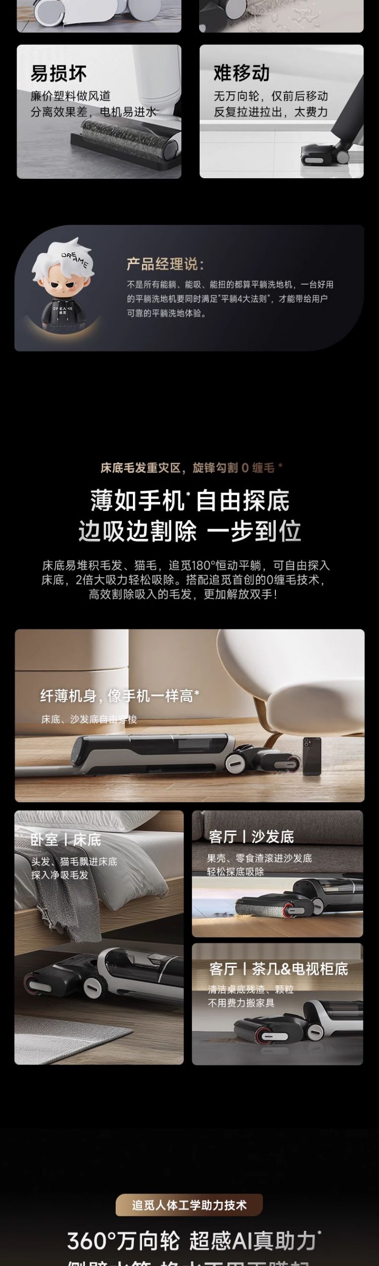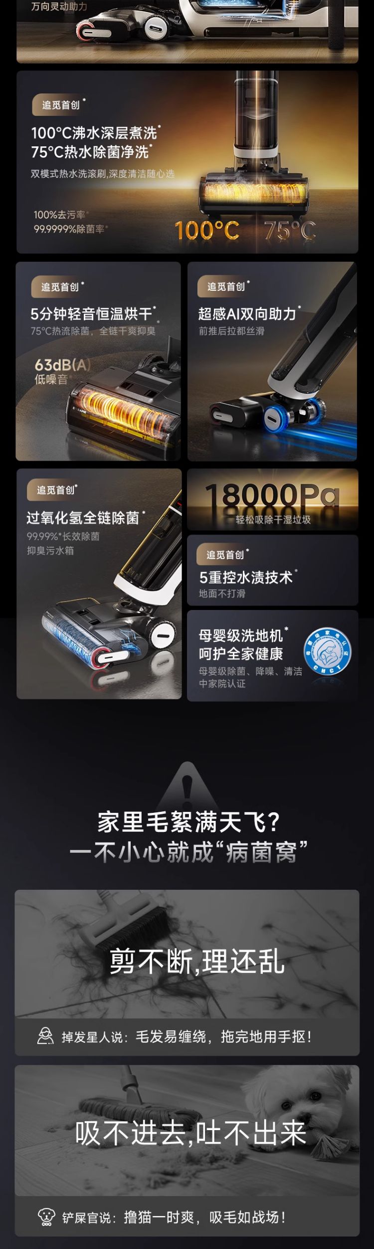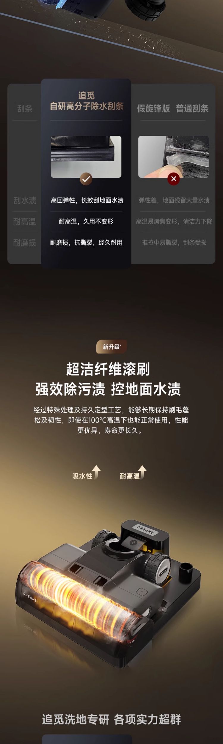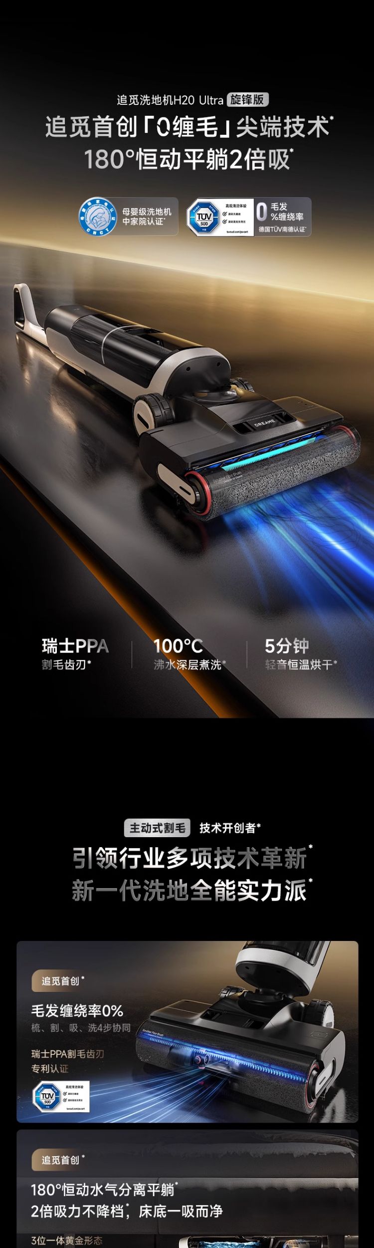 商品名称:追觅H20Ultra旋锋版躺平无线智能家用热水洗地机高温速干双贴边吸拖洗烘一体扫地机割毛式防缠绕吸尘器