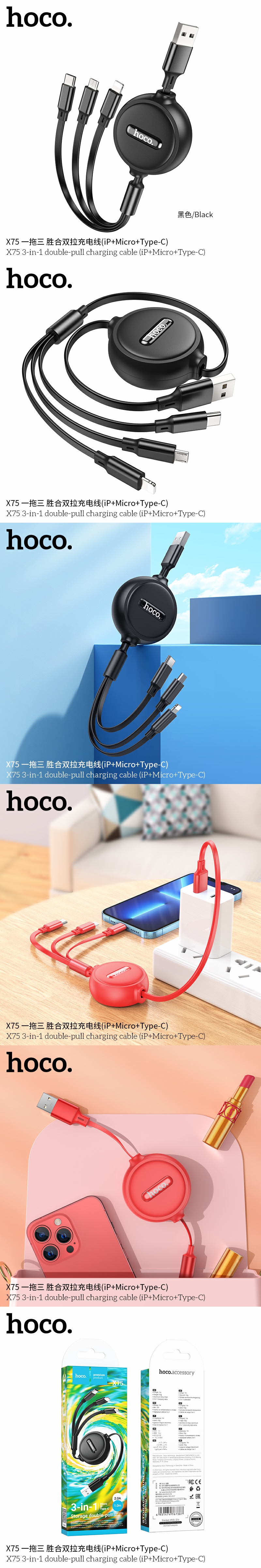 商品名称:hoco. 一拖三 胜合双拉充电线X75黑色(iP+Micro+Type-C)