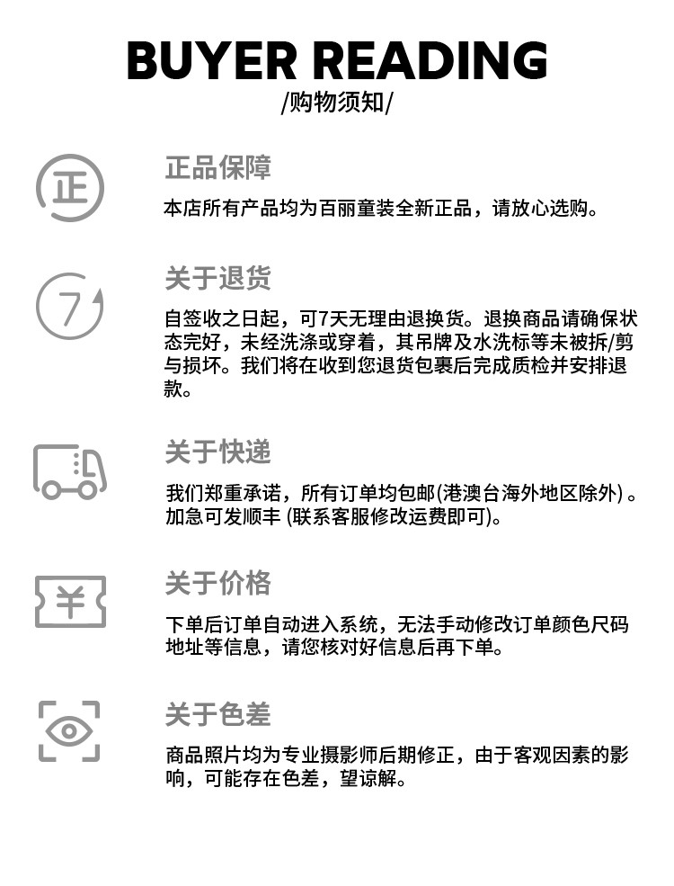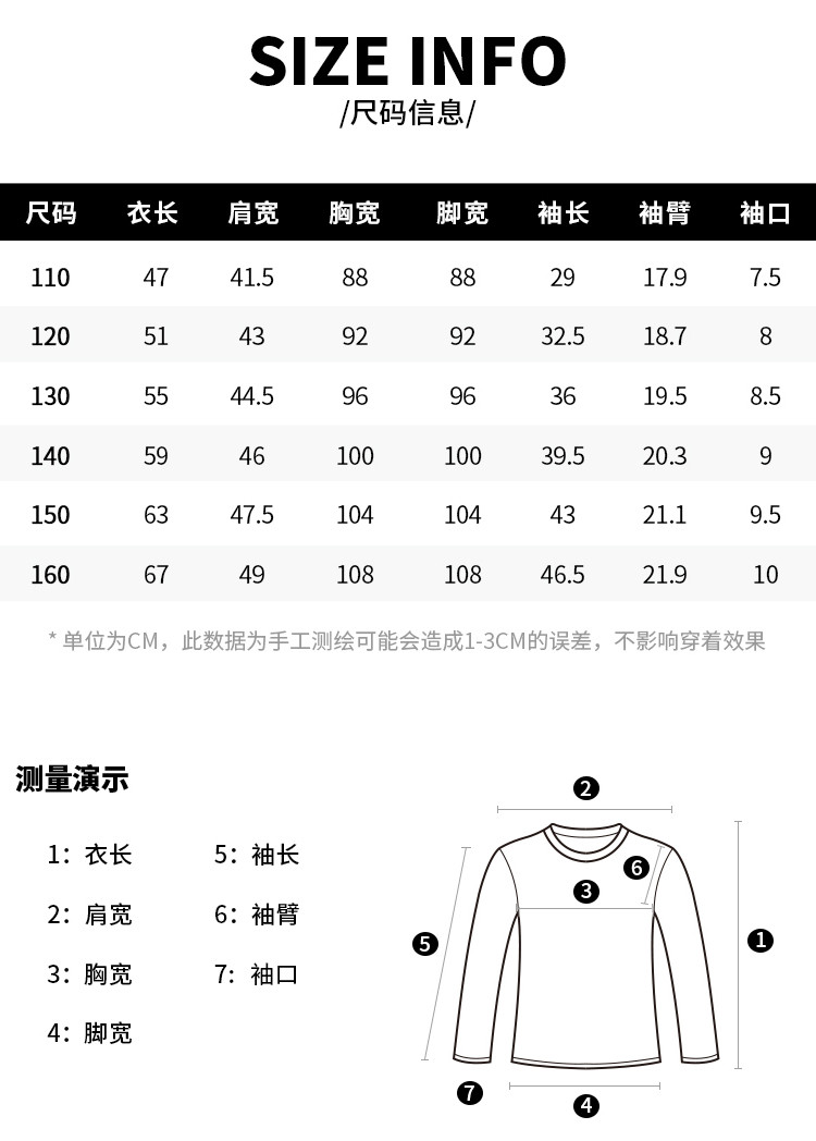 | 尺码 | 衣长(cm) | 肩宽(cm) | 身高(cm) | 袖长(cm) | 适合年龄 | 胸围(cm) | 号型 |