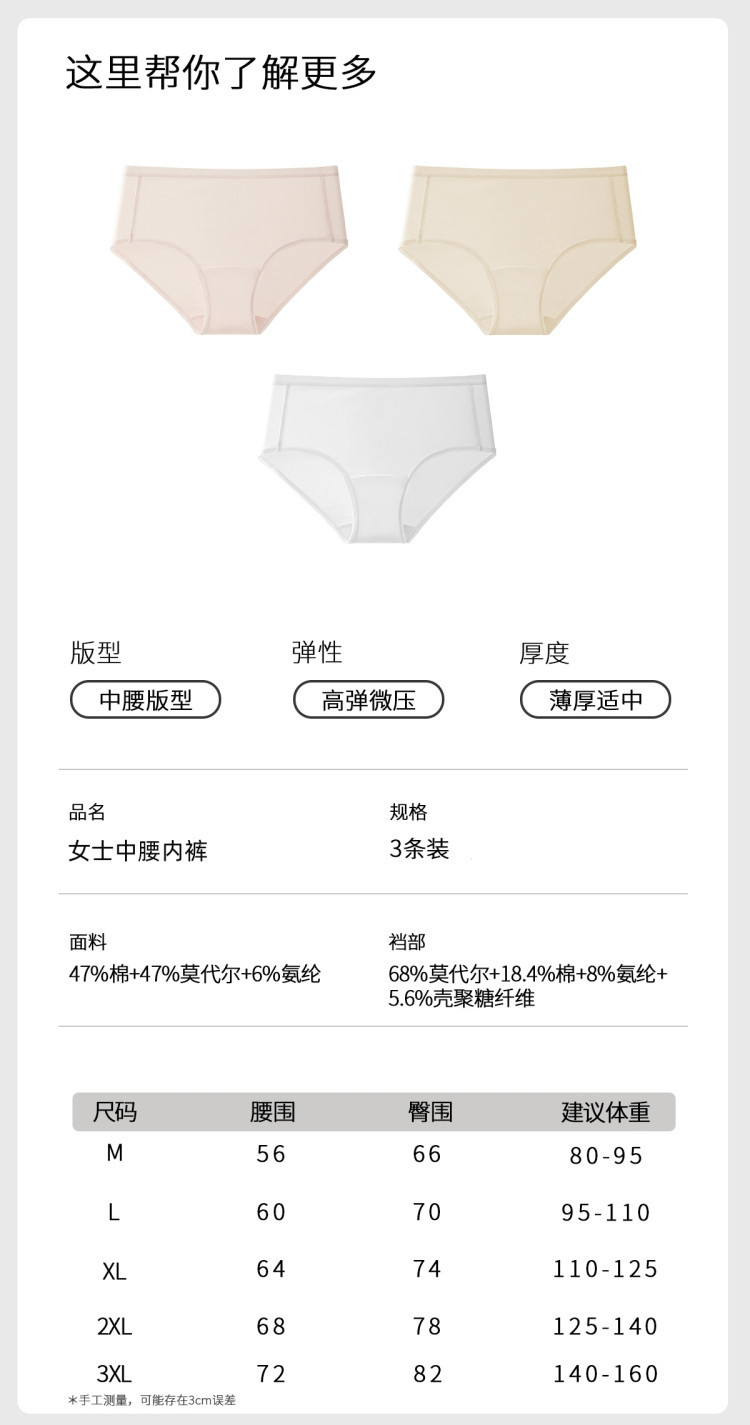 商品名称:【抑菌中腰内裤3条装】a类无痕贴肤柔软舒适透气女士内裤衩 655307