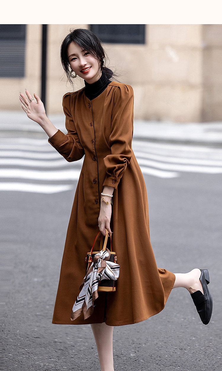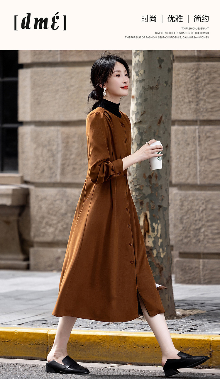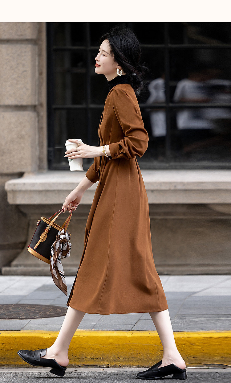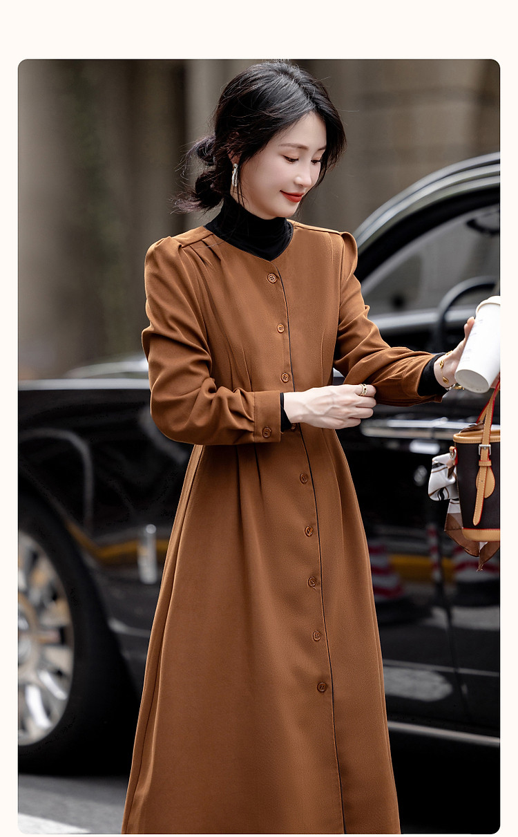 【美拉德穿搭】春秋学院风通勤圆领撞色嵌条褶裥收腰中长连衣裙 538113