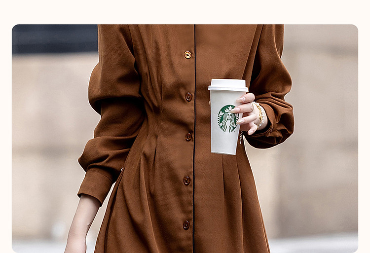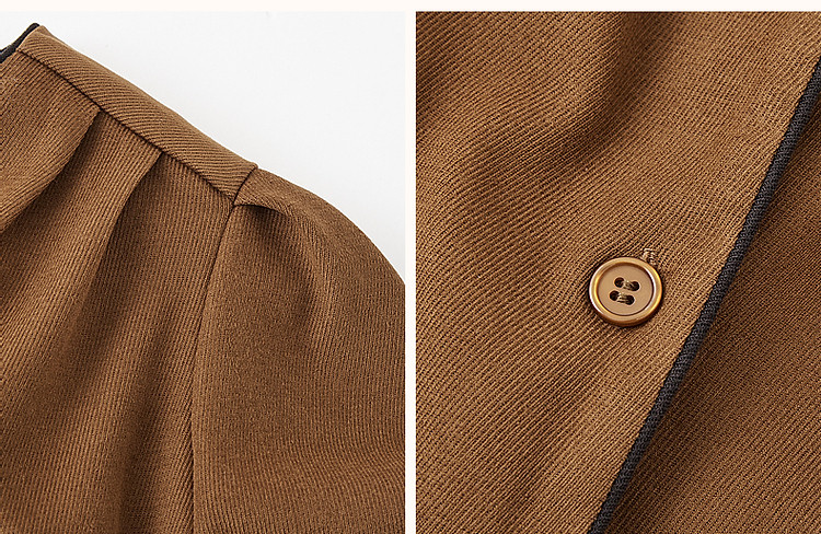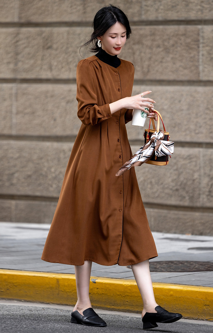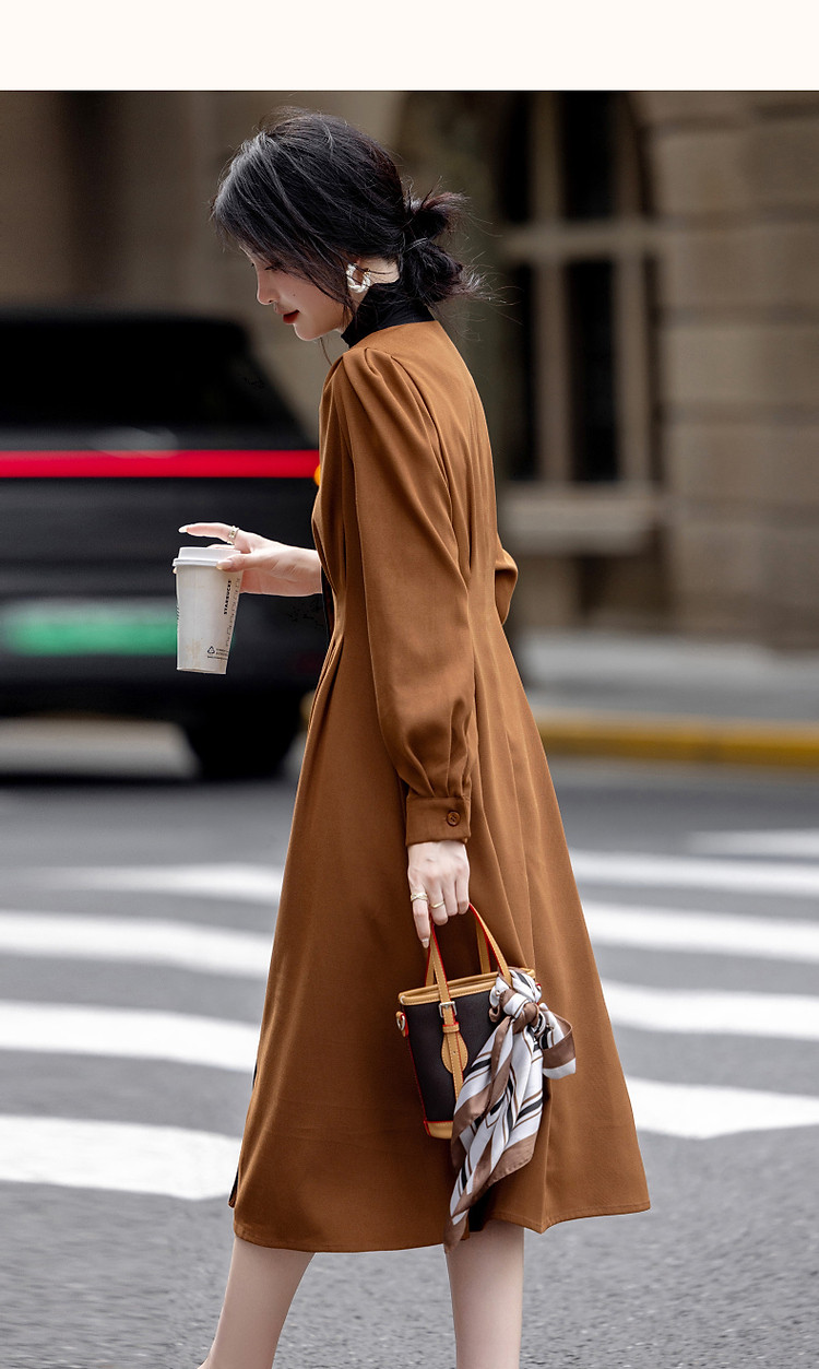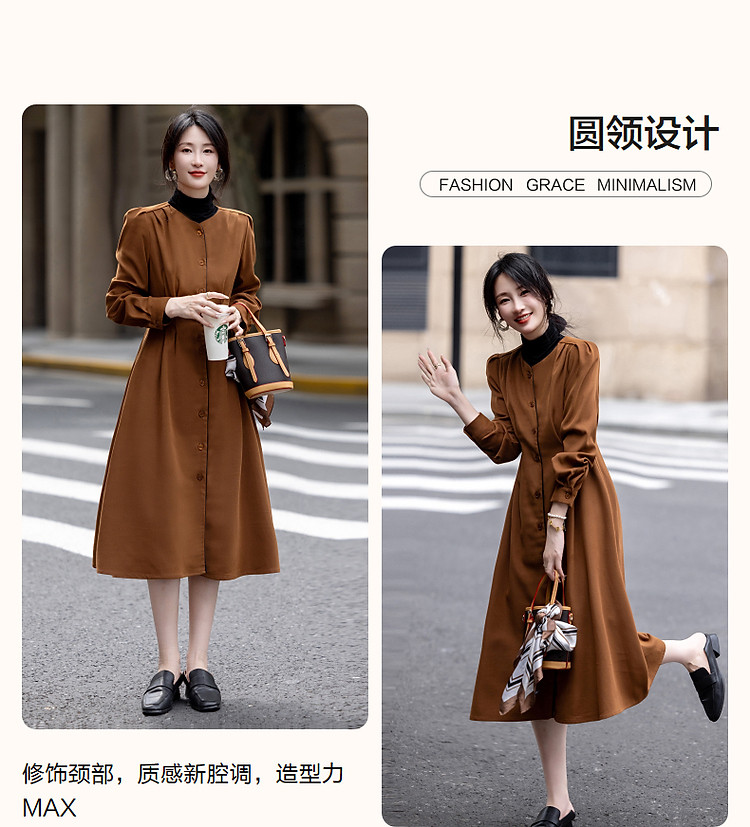 商品名称:【美拉德穿搭】春秋学院风通勤圆领撞色嵌条褶裥收腰中长连衣裙 538113