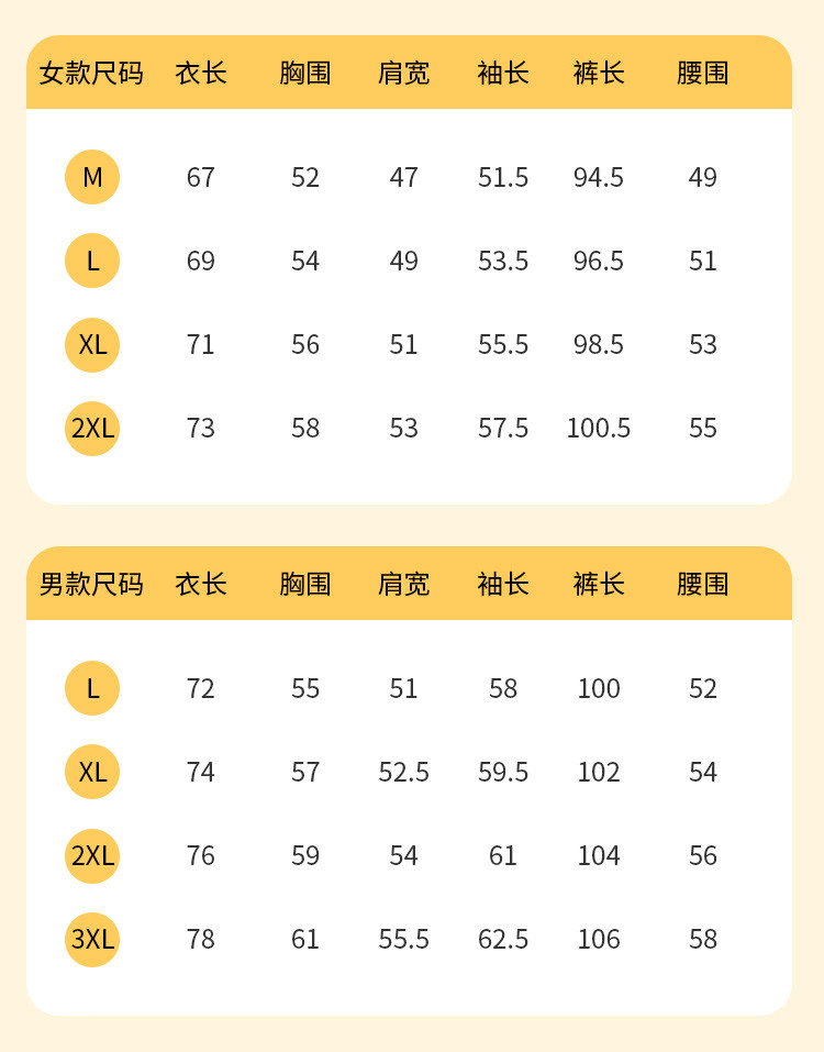 | 尺码 | 衣长(cm) | 肩宽(cm) | 腰围(cm) | 裤长(cm) | 前浪(cm) | 袖长(cm) | 胸围(cm) | 号型 |
