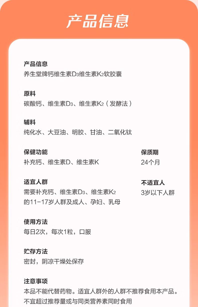 商品名称:养生堂 钙片维生素d3维生素k2软胶囊 60粒 青少年孕妇哺乳期中老年补钙
