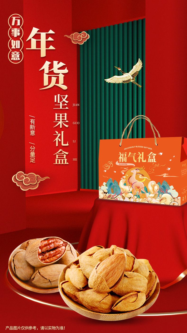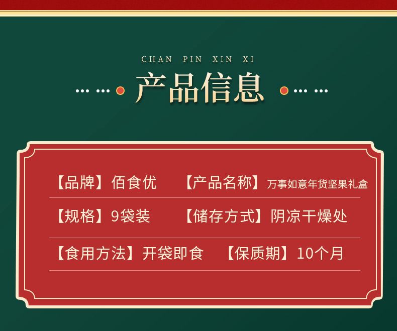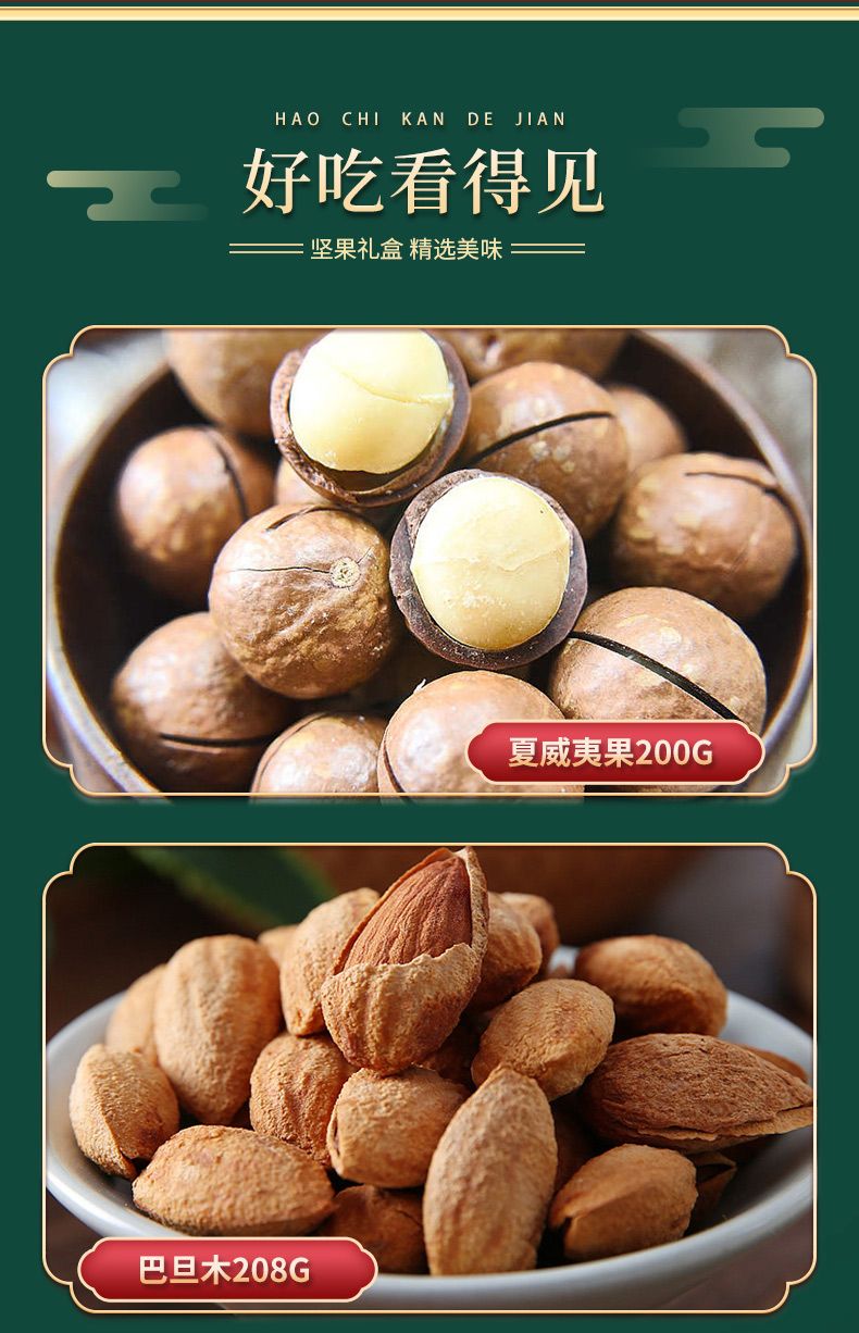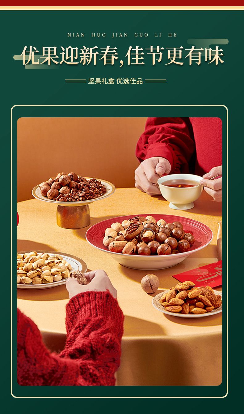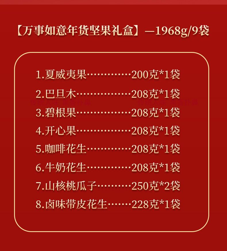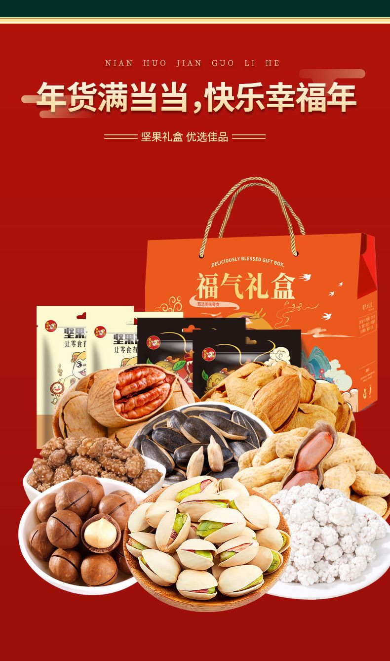 商品名称:佰食优 万事如意年货坚果礼盒(夏威夷果200g*1/巴旦木208g*1/碧根果208g*1/开心果208g*1/山核桃瓜