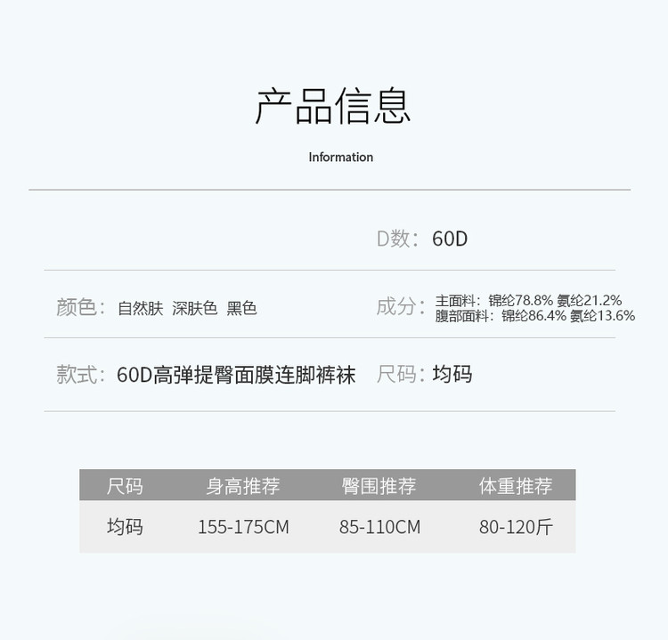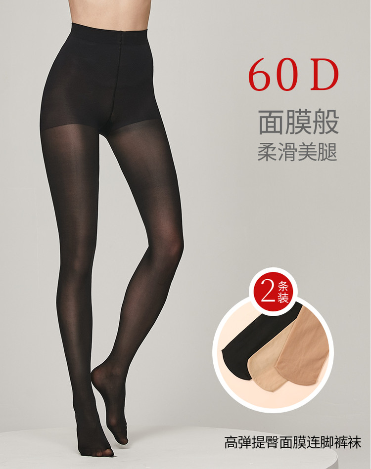 商品名称:【2条装】面膜丝滑肤感60D高弹收腹提臀显瘦打底连脚裤袜女 776862