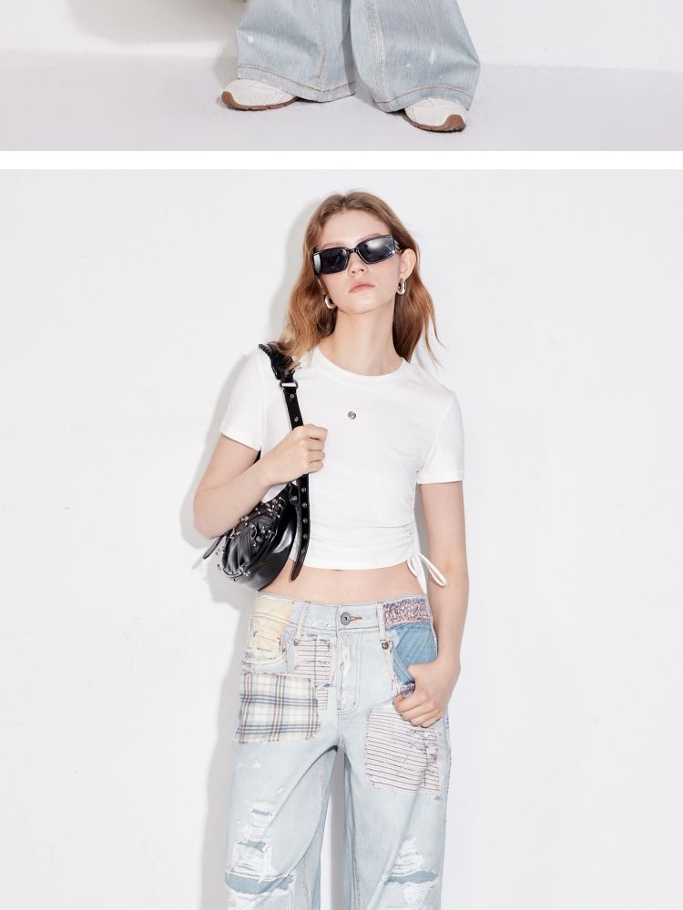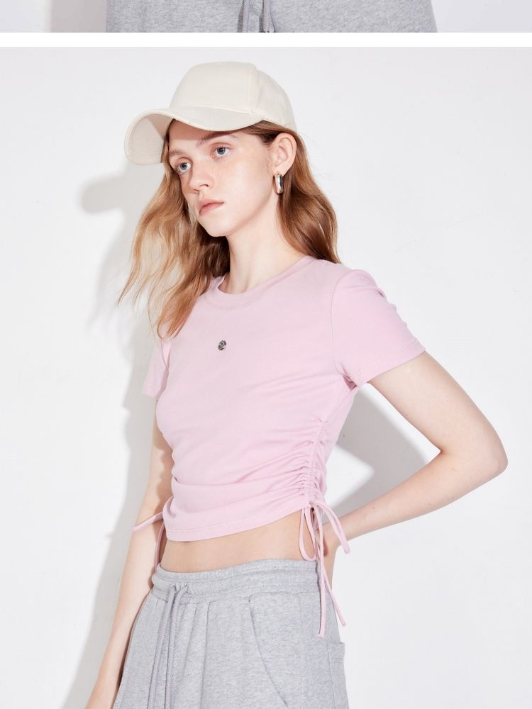【可调节侧腰抽绳】2025夏季百搭修身短款正肩纯色圆领T恤女 511002