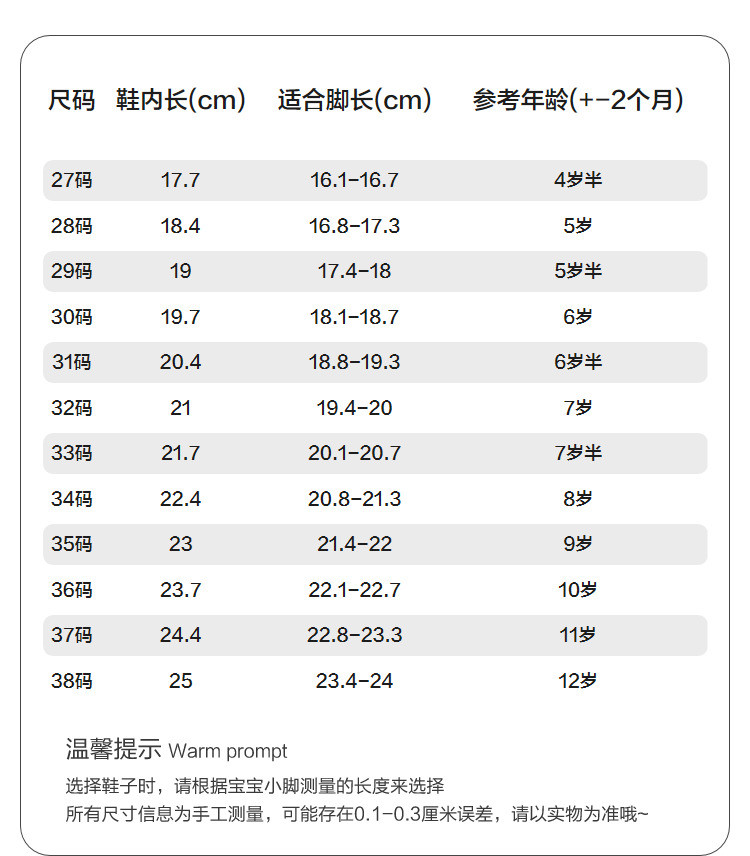 | 33码(脚长20.5/内长21.7) | 33 | 205 | 217 |