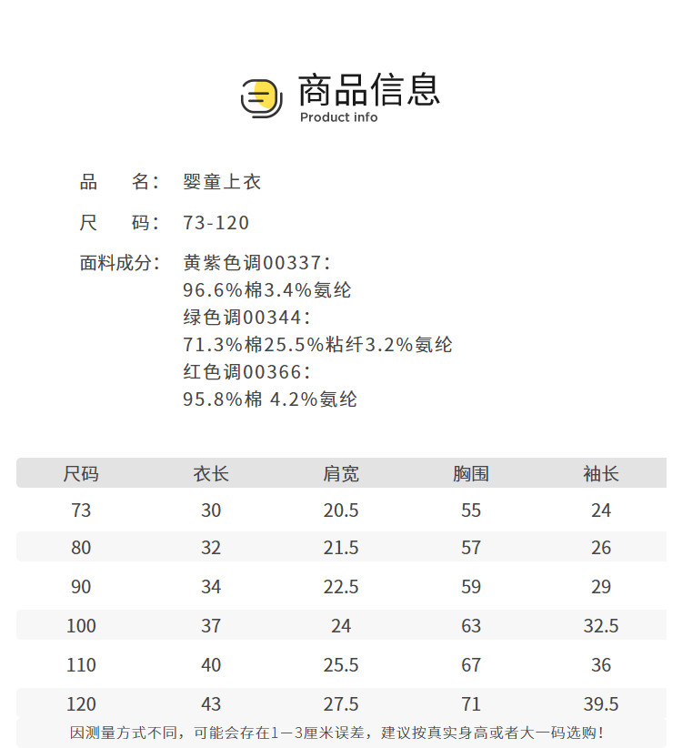 | 尺码 | 衣长(cm) | 肩宽(cm) | 身高(cm) | 袖长(cm) | 适合年龄 | 胸围(cm) | 号型 |