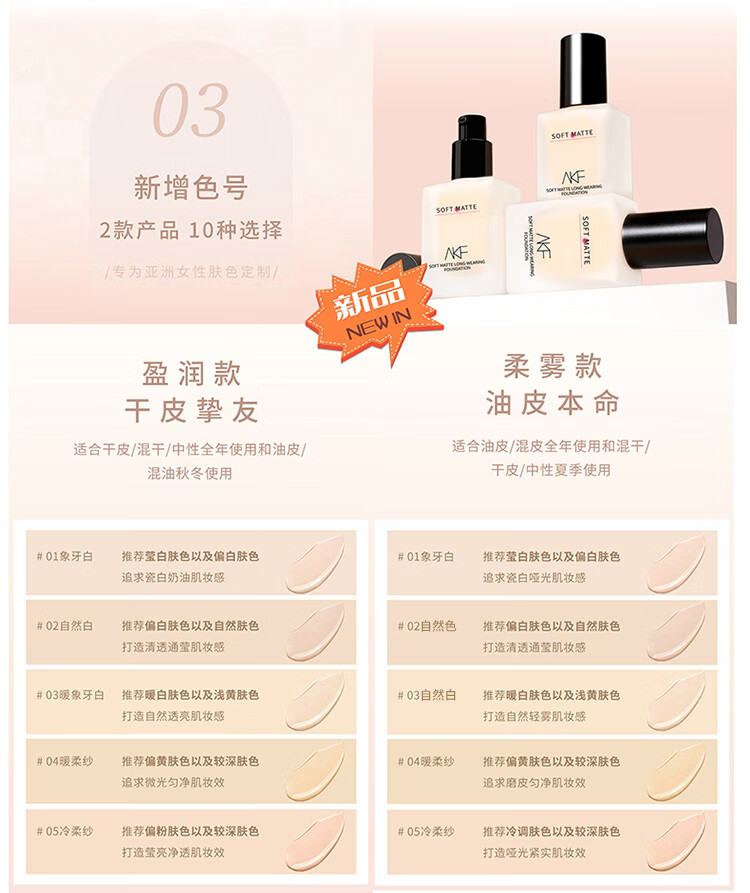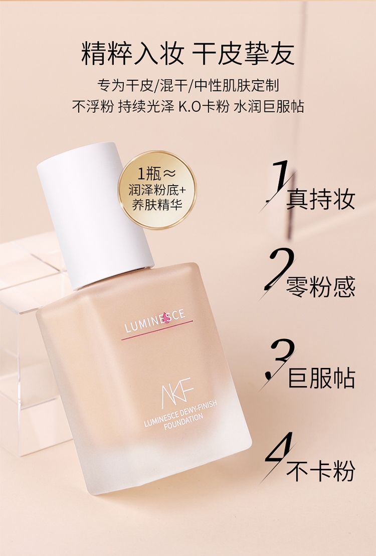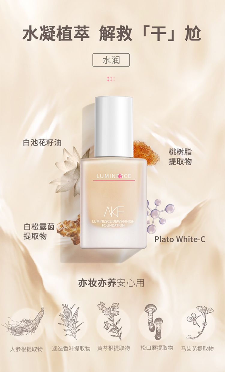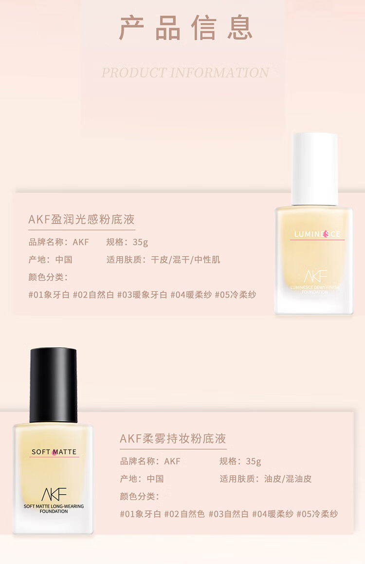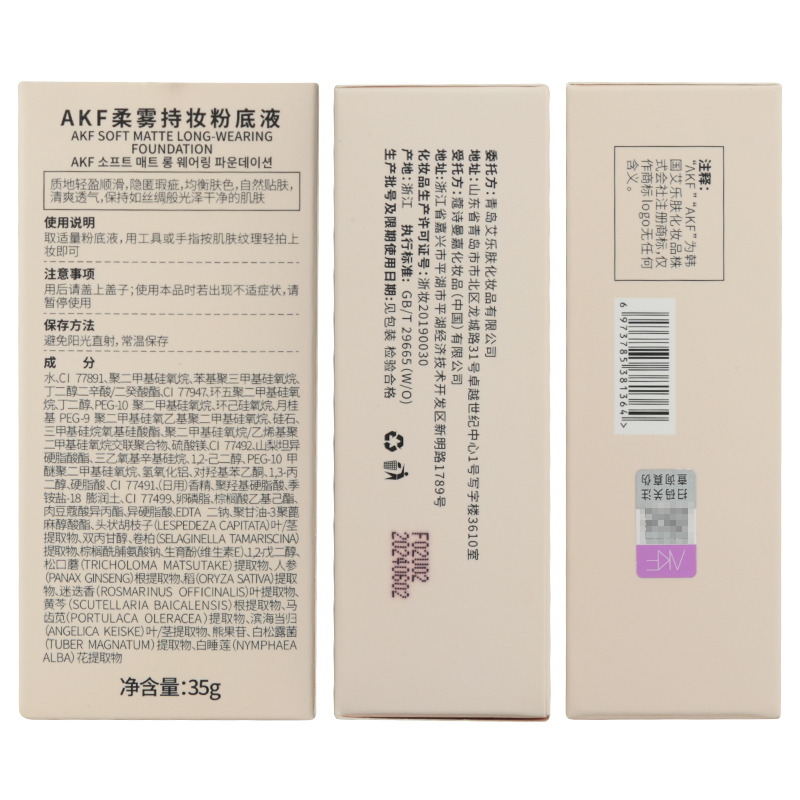 商品名称:AKF 柔雾持妆粉底液 35g 哑光持久服帖不脱妆遮瑕控油粉底液