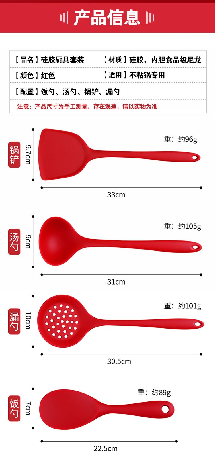 红色锅铲:96g 汤勺:100g 饭勺:75g 漏勺:90g