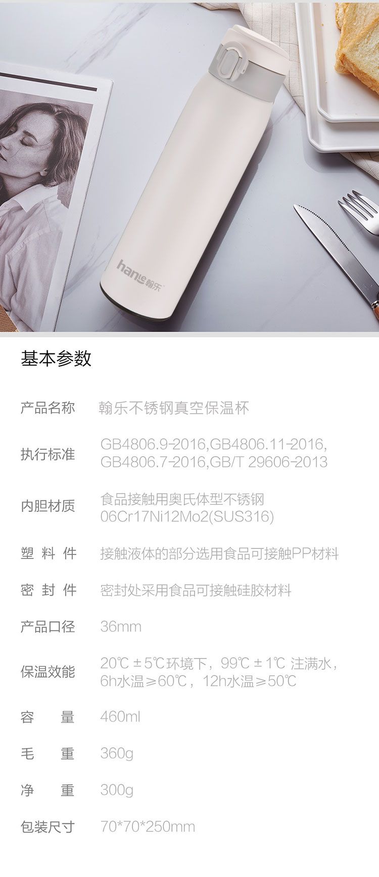 商品名称:翰乐 304不锈钢保温杯 460ml