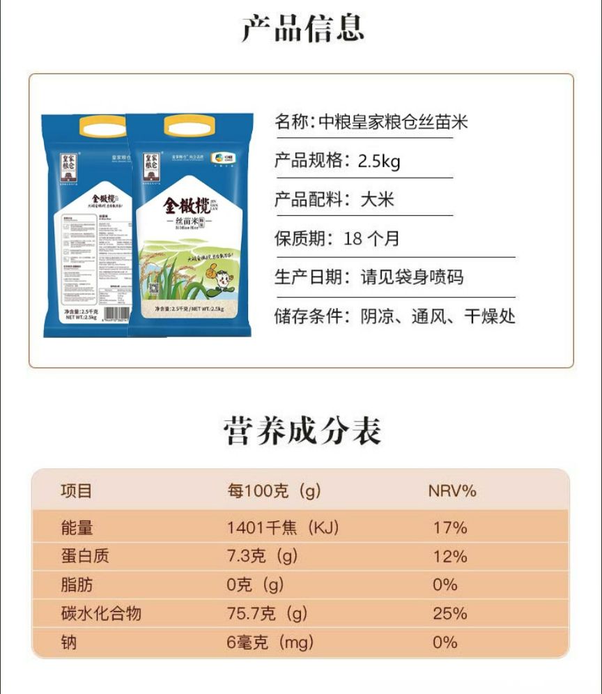 商品名称:中粮 皇家粮仓 金橄榄丝苗米 2.5kg