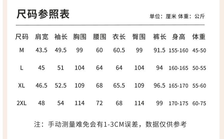 | 尺码 | 肩宽(cm) | 袖长(cm) | 衣长(cm) | 身高(cm) | 腰围(cm) | 裤长(cm) | 体重(kg) | 臀围(cm) | 胸围(cm) | 号型 |