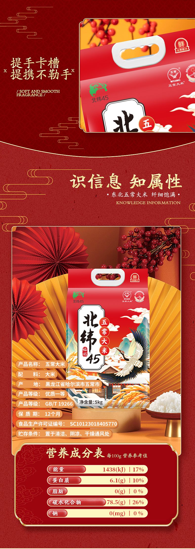 商品名称:北纬45 五常福稻五常大米东北大米 5kg