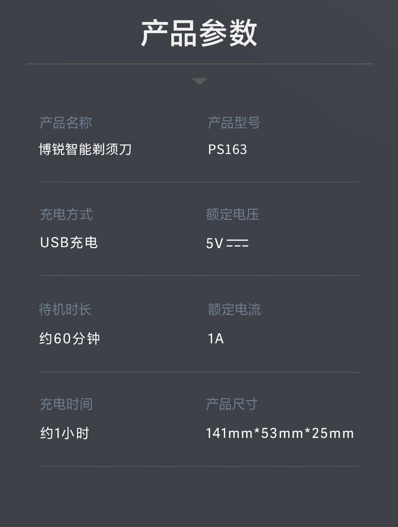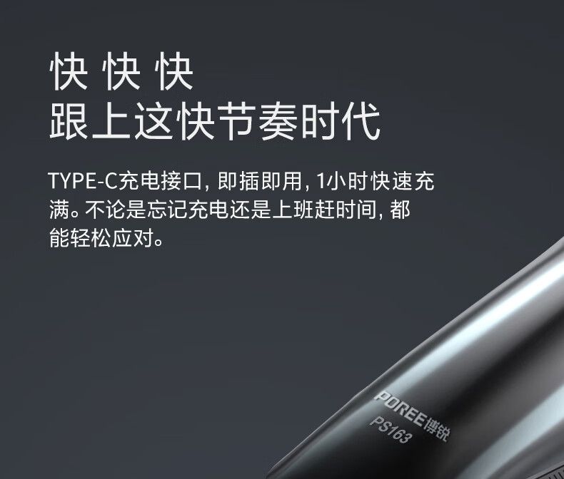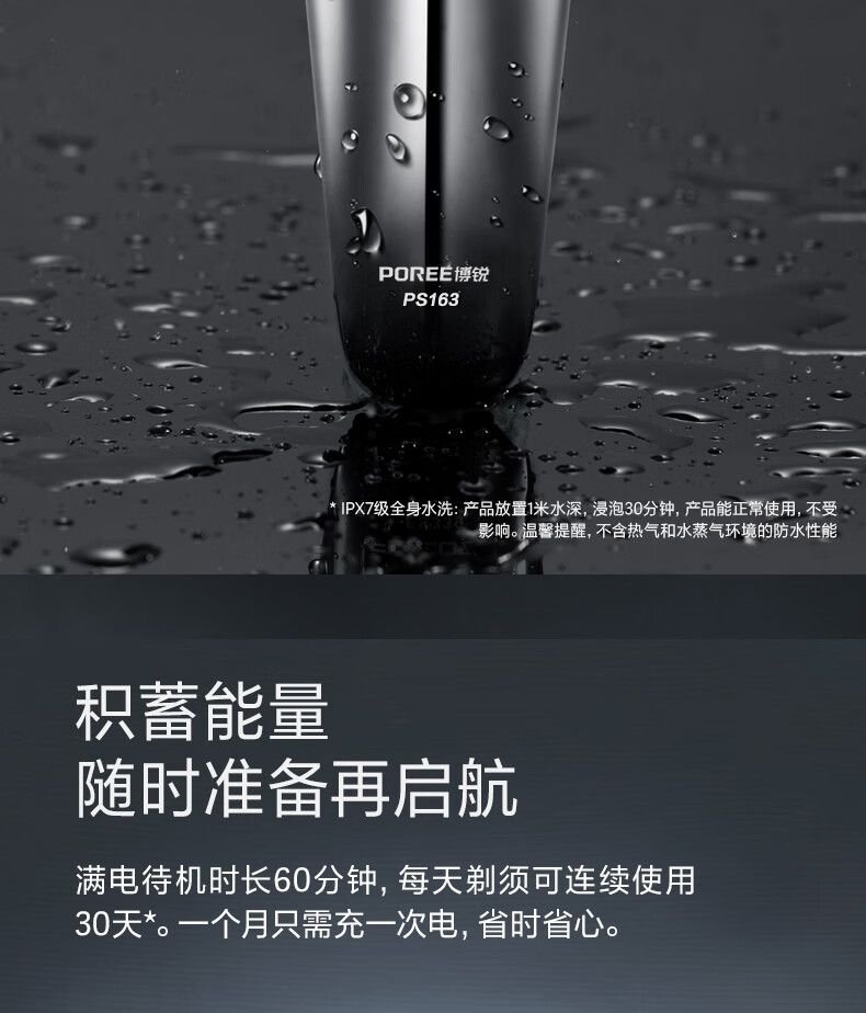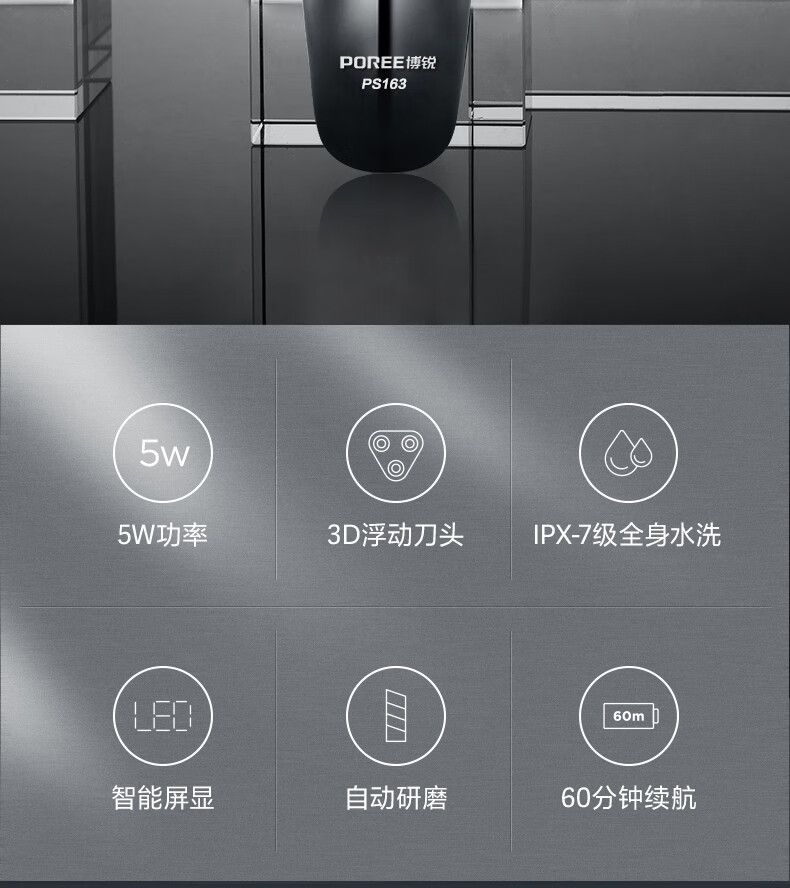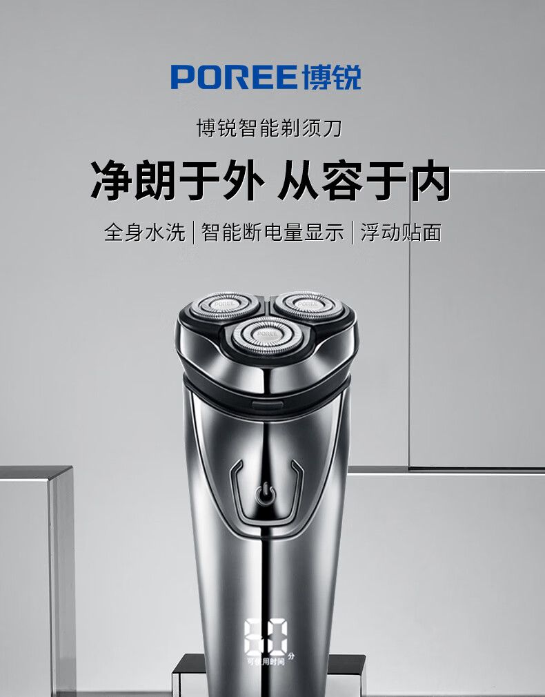 商品名称:博锐(POREE)剃须刀电动刮胡刀全身水洗刮胡子刀三刀头智能快速充电胡须刀 PS163