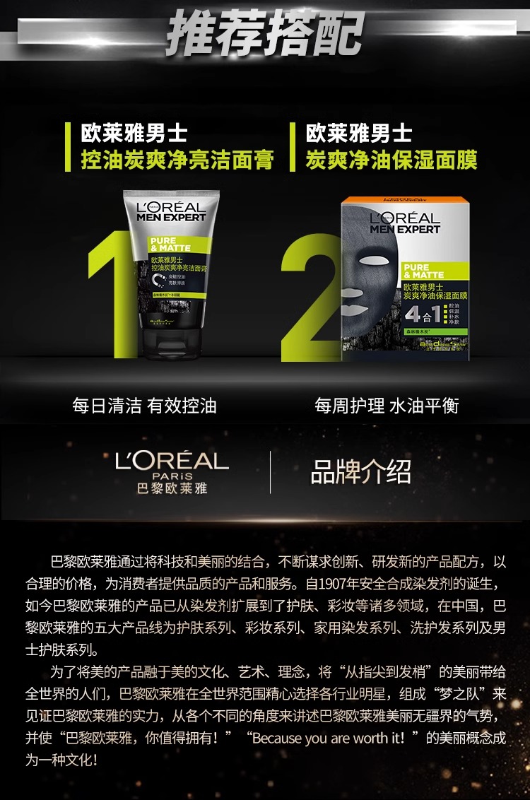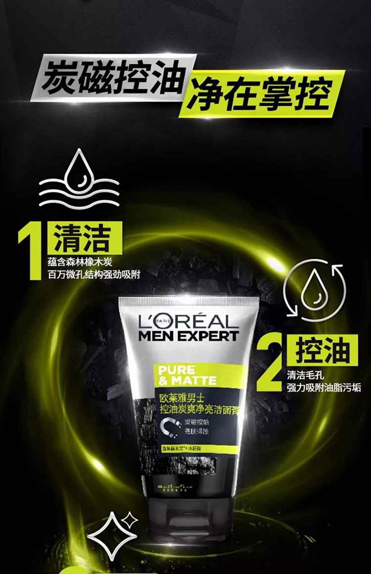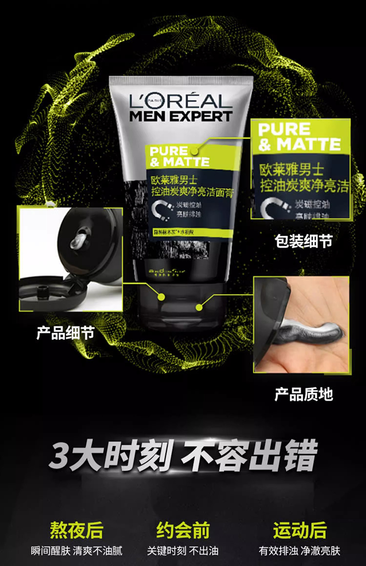 商品名称:L'oreal/欧莱雅 男士洗面奶 100ml 炭爽控油净亮洁面膏洁净亮肤