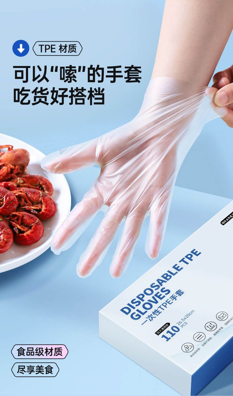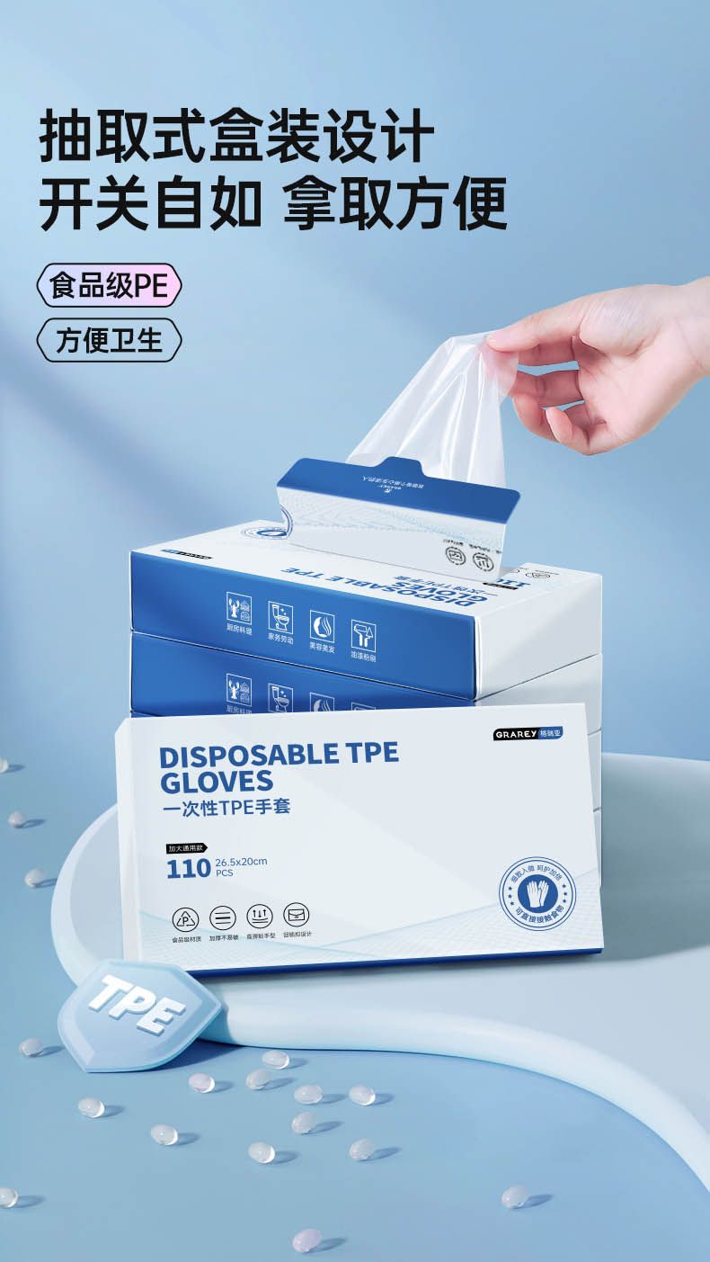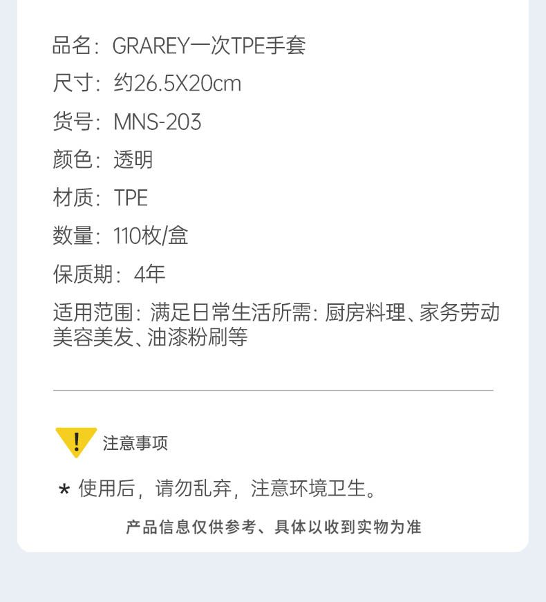 商品名称:GRAREY(格瑞亚)一次性TPE手套食品级材质加厚防滑110枚/盒家用防水防油