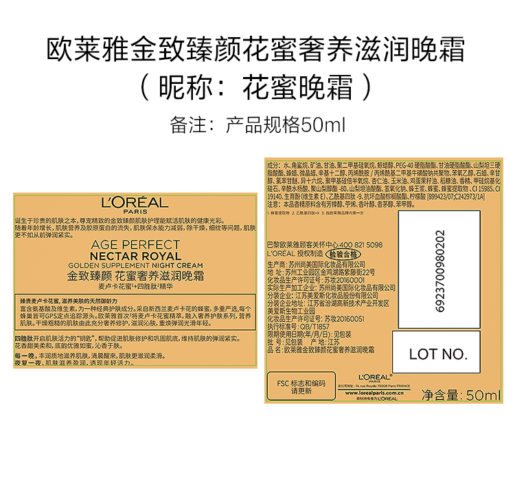 商品名称:L'oreal/欧莱雅 小蜜罐晚霜 50g 金致臻颜花蜜奢养滋润面霜