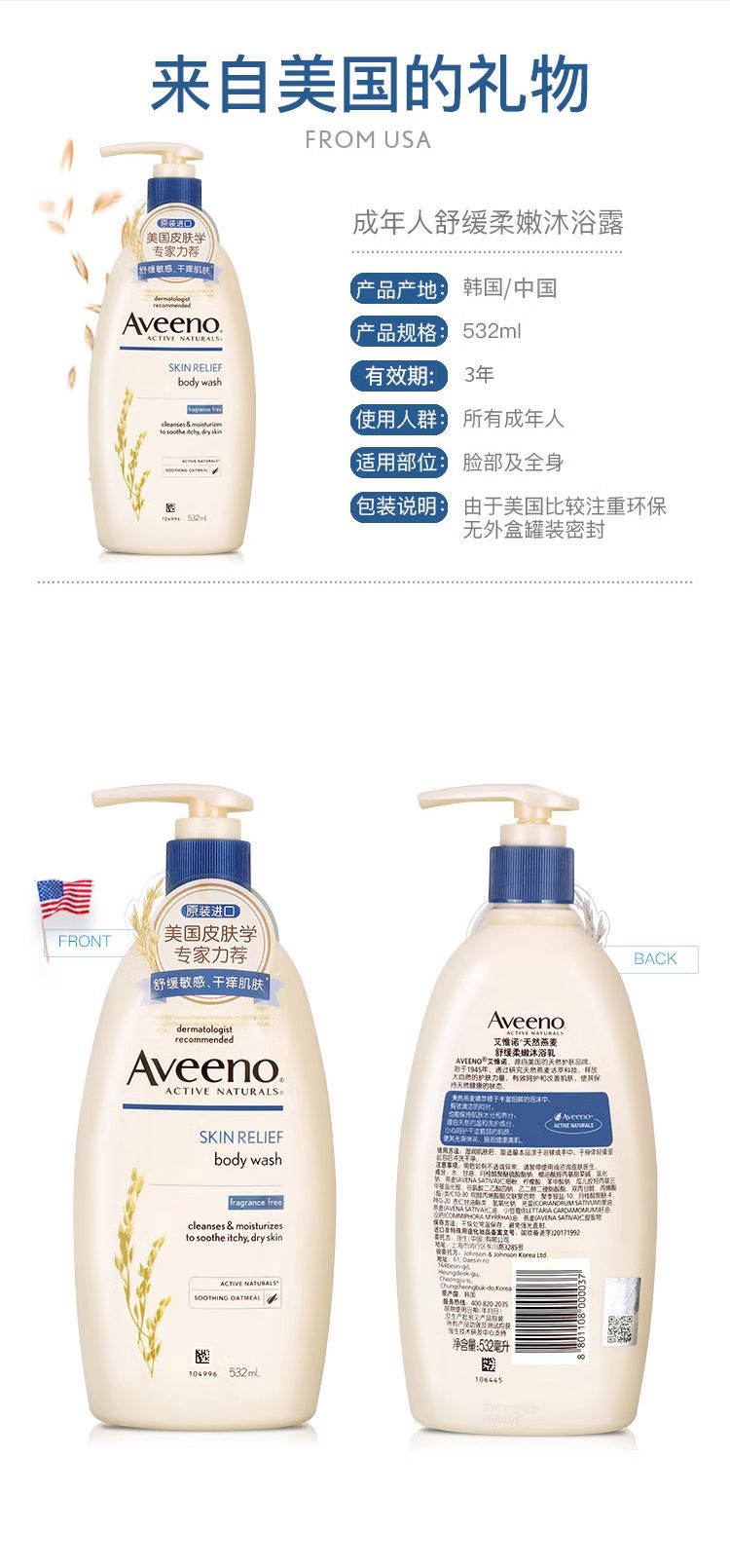 商品名称:Aveeno/艾惟诺 成人舒缓柔嫩沐浴露(无香型)532ml/瓶