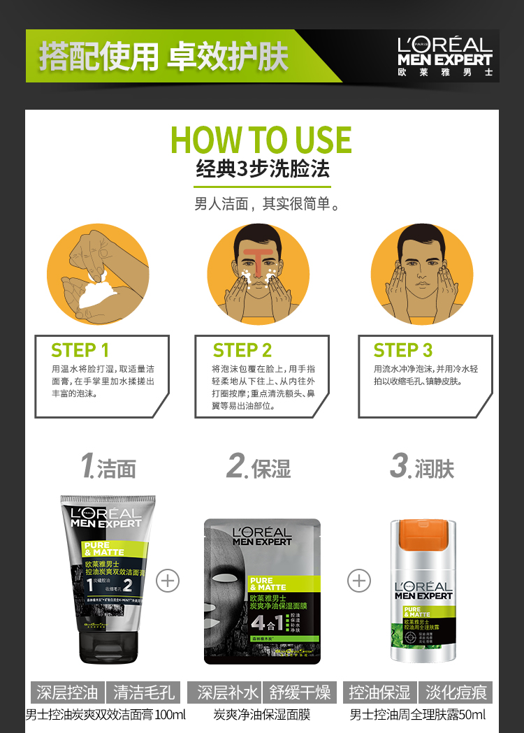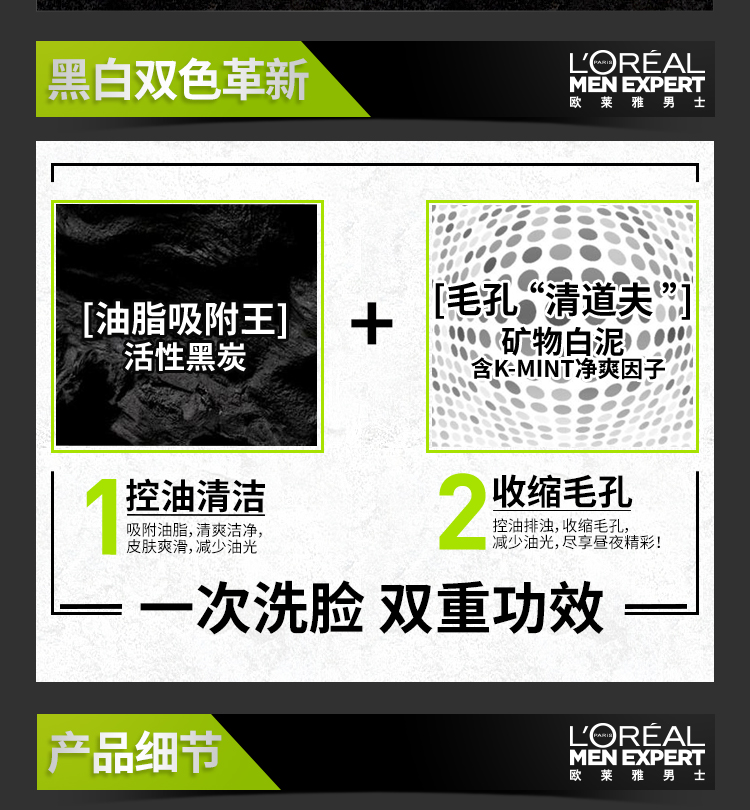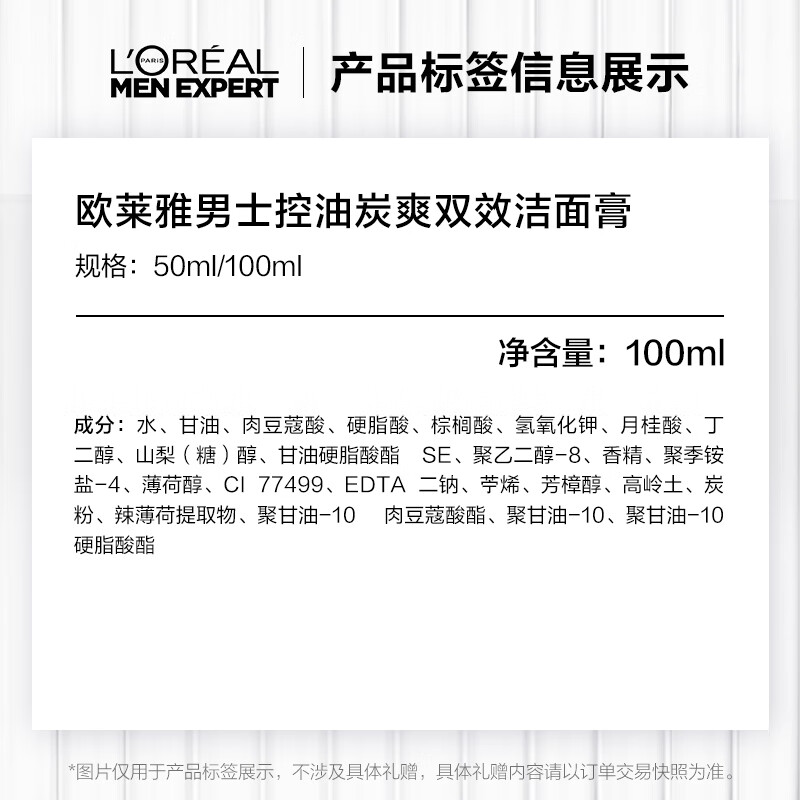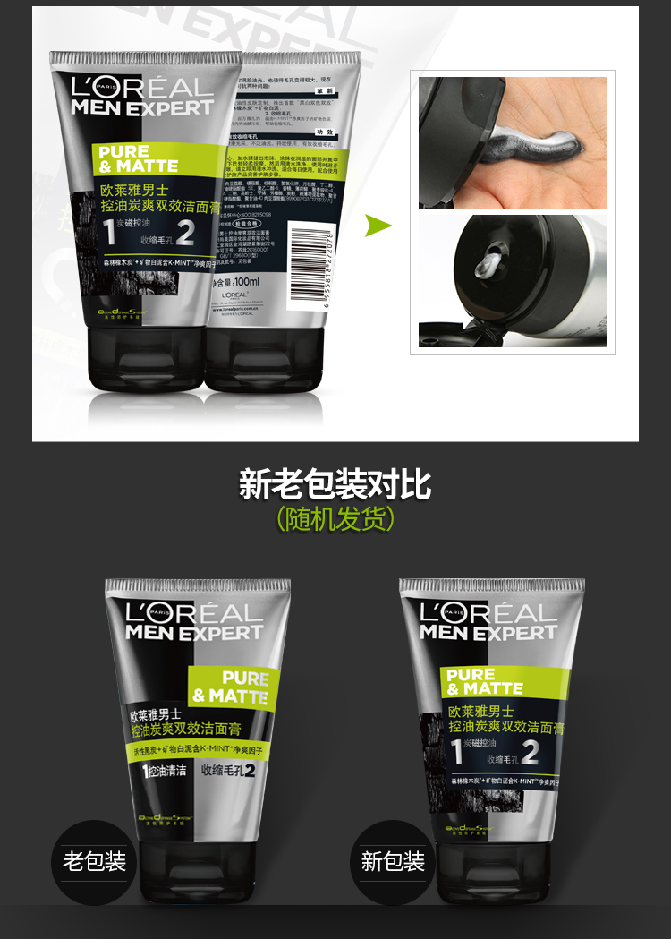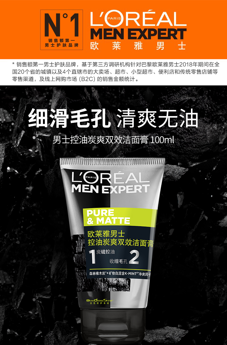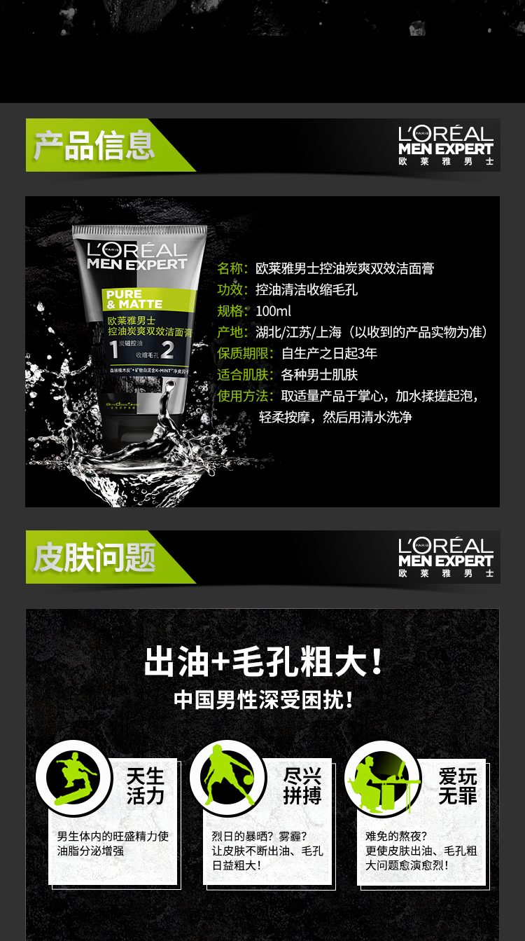 商品名称:L'oreal/欧莱雅 男士炭爽双效控油洁面膏 100ml 深层清洁洗面奶男士护肤