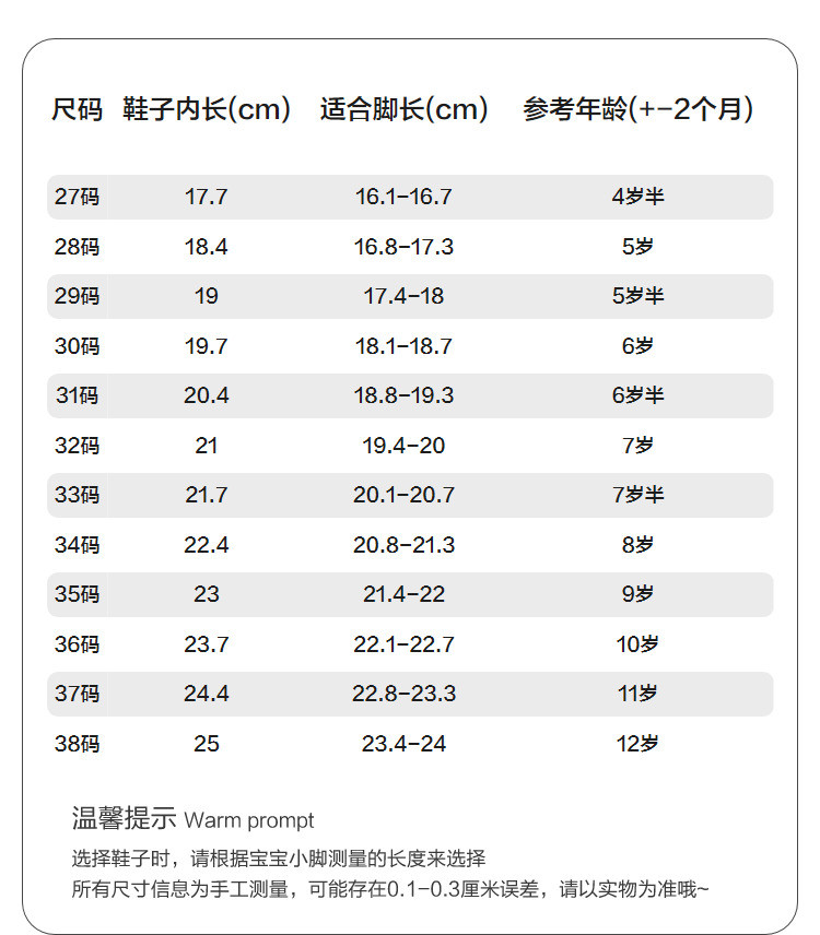 | 33码(脚长20.1/内长21.7) | 33 | 205 | 217 |