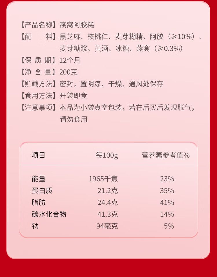 商品名称:固本堂燕窝阿胶糕200克礼盒送长辈补品营养品气血