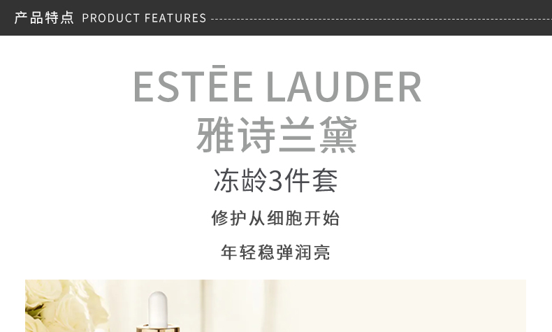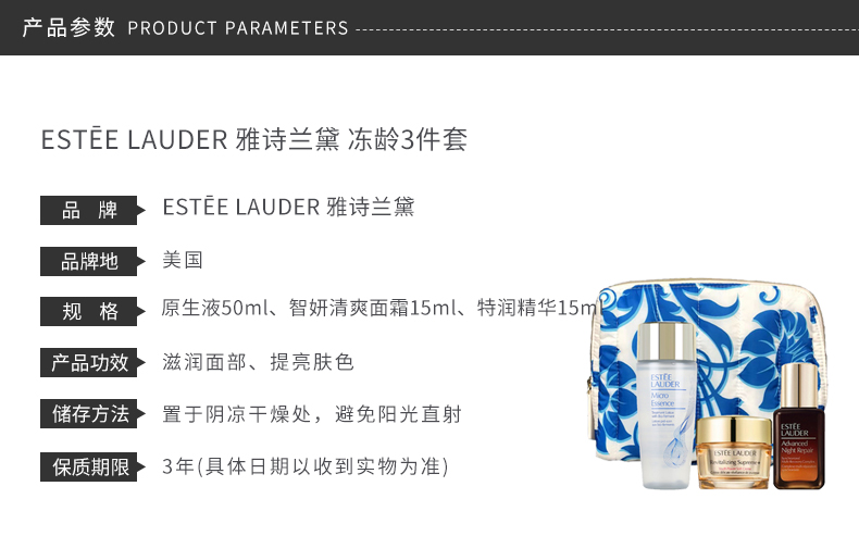 商品名称:Estee Lauder/雅诗兰黛 冻龄三件套(原生液50ml+智妍清爽面霜15ml+特润精华15ml)袋子随机发