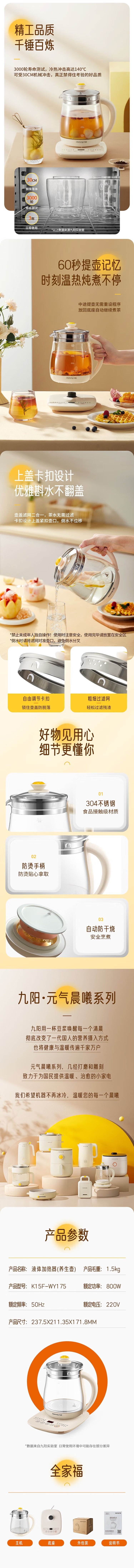 商品名称:九阳养生壶玻璃花茶壶K15F-WY175 12大功能 1.5L专注炖煮 防糊底 电热水壶