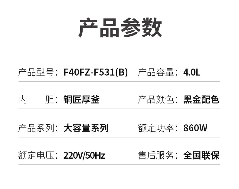 商品名称:九阳 多功能电饭煲 F40FZ-F531B 七段控温24小时预约 4L容量 黑金色