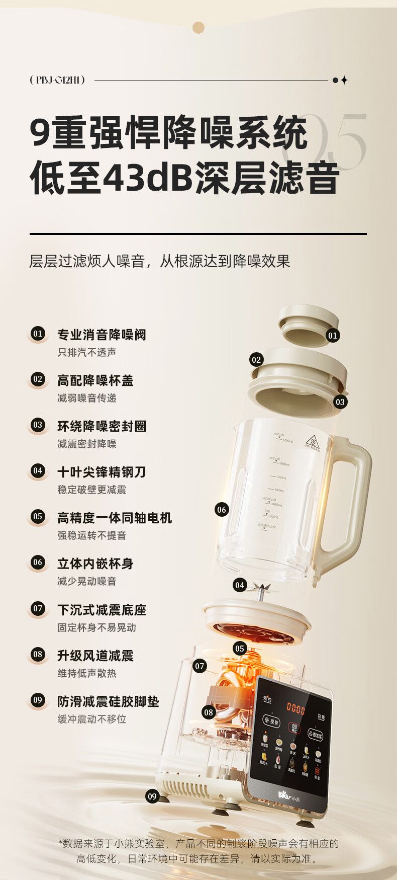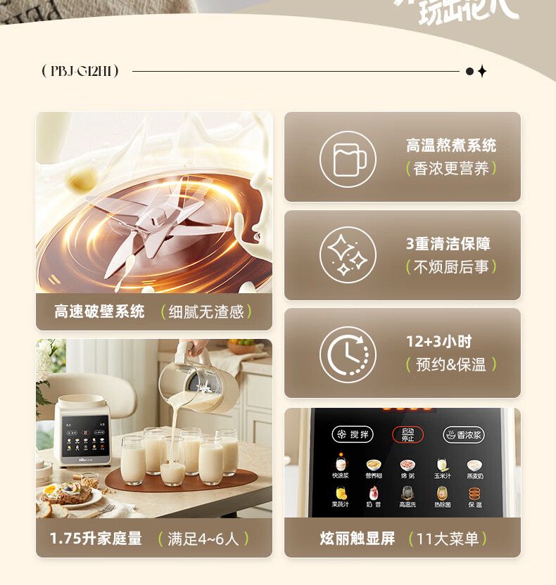 小熊 破壁机PBJ-G12H1 家用1.75L大容量多功能降噪预约加热全自动豆浆机榨汁机辅食机早餐机