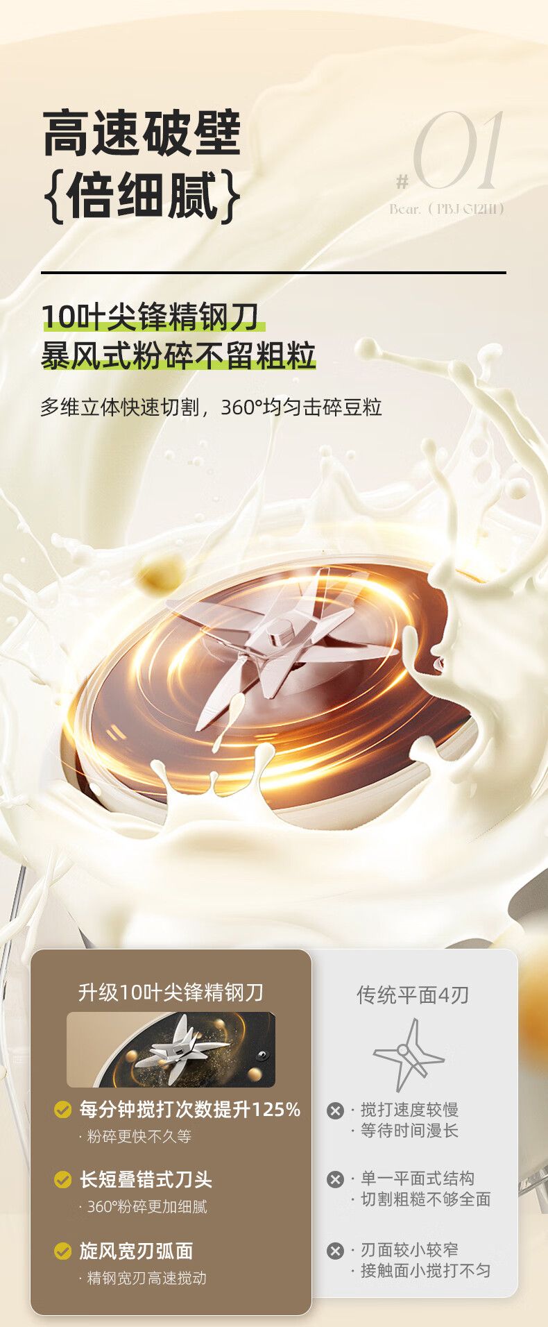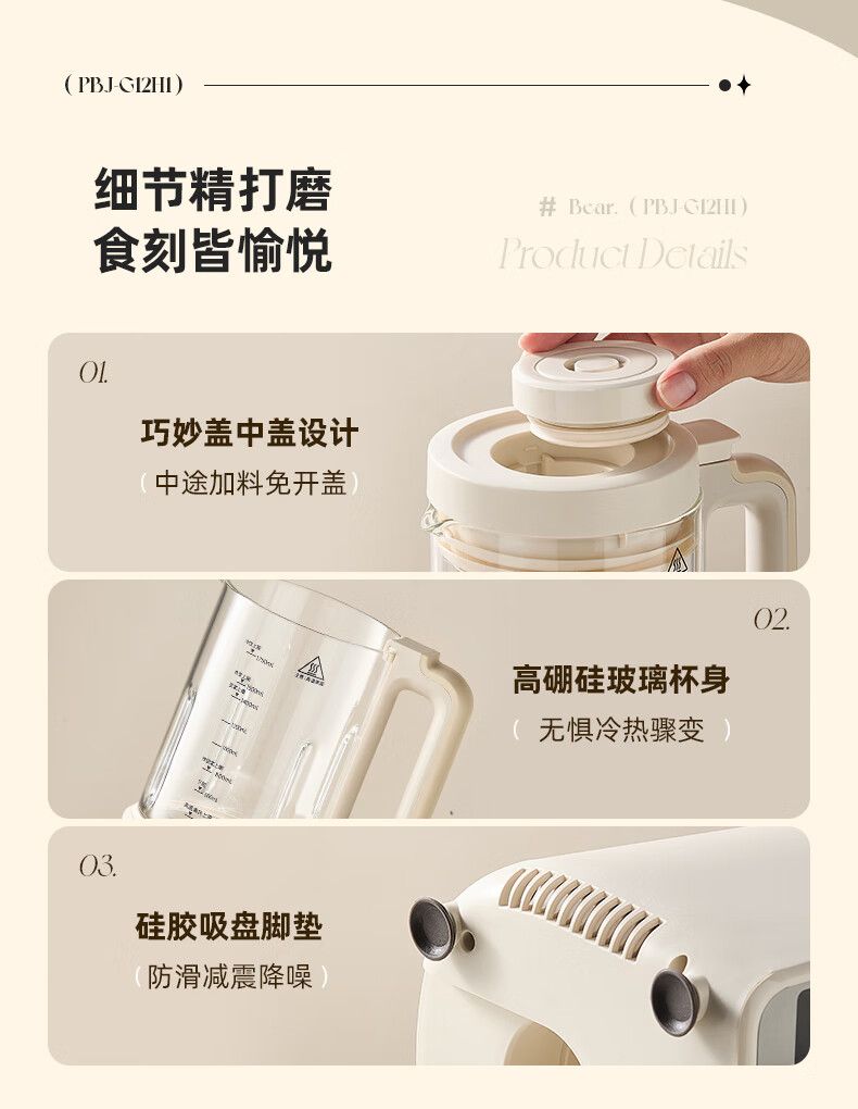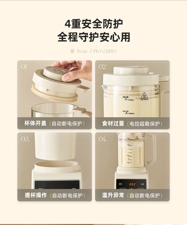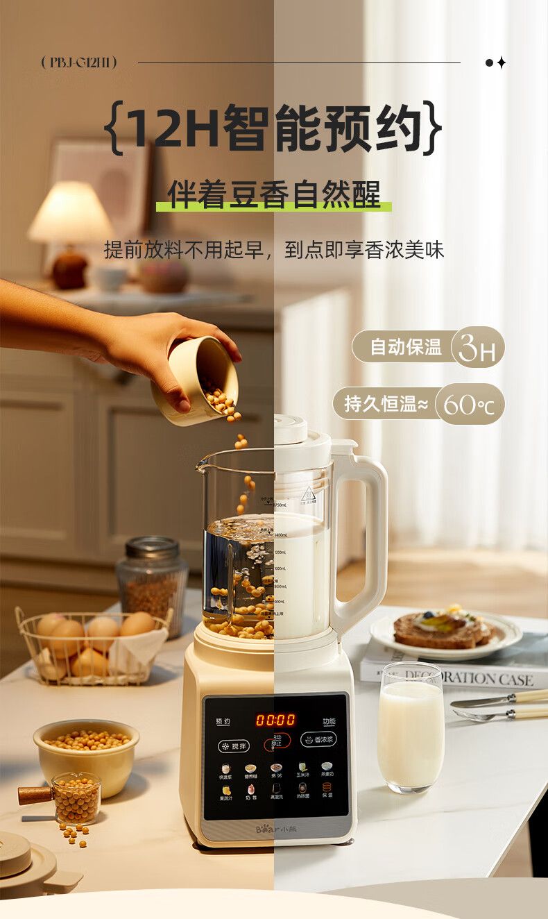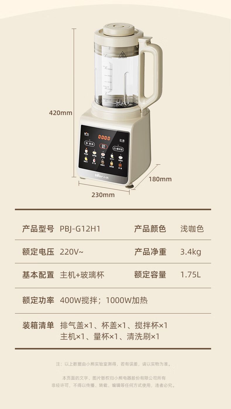 商品名称:小熊 破壁机PBJ-G12H1 家用1.75L大容量多功能降噪预约加热全自动豆浆机榨汁机辅食机早餐机