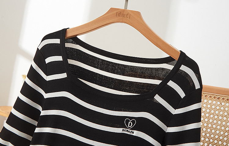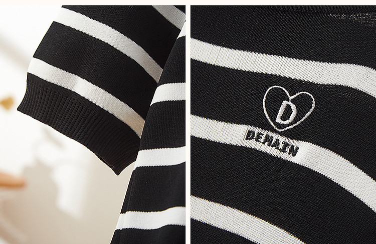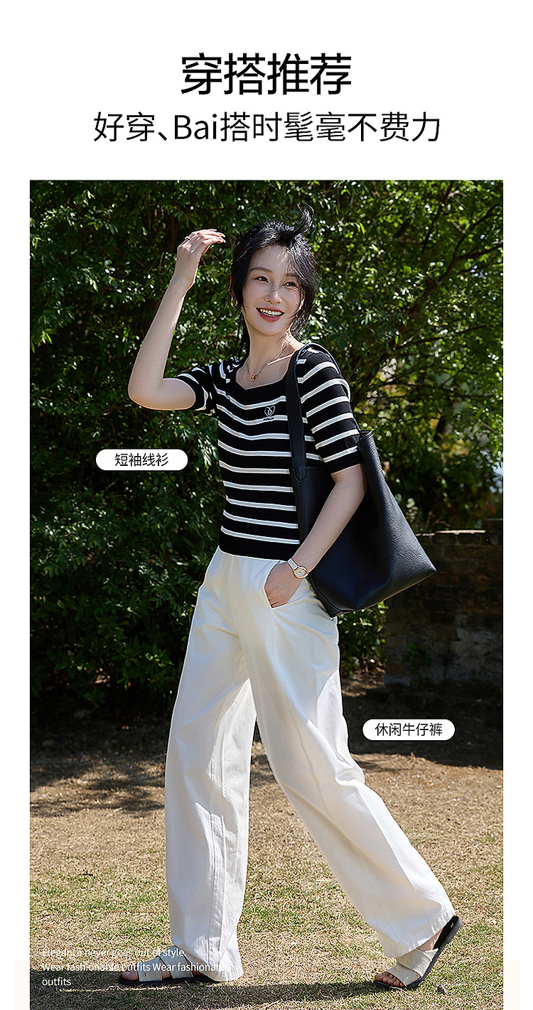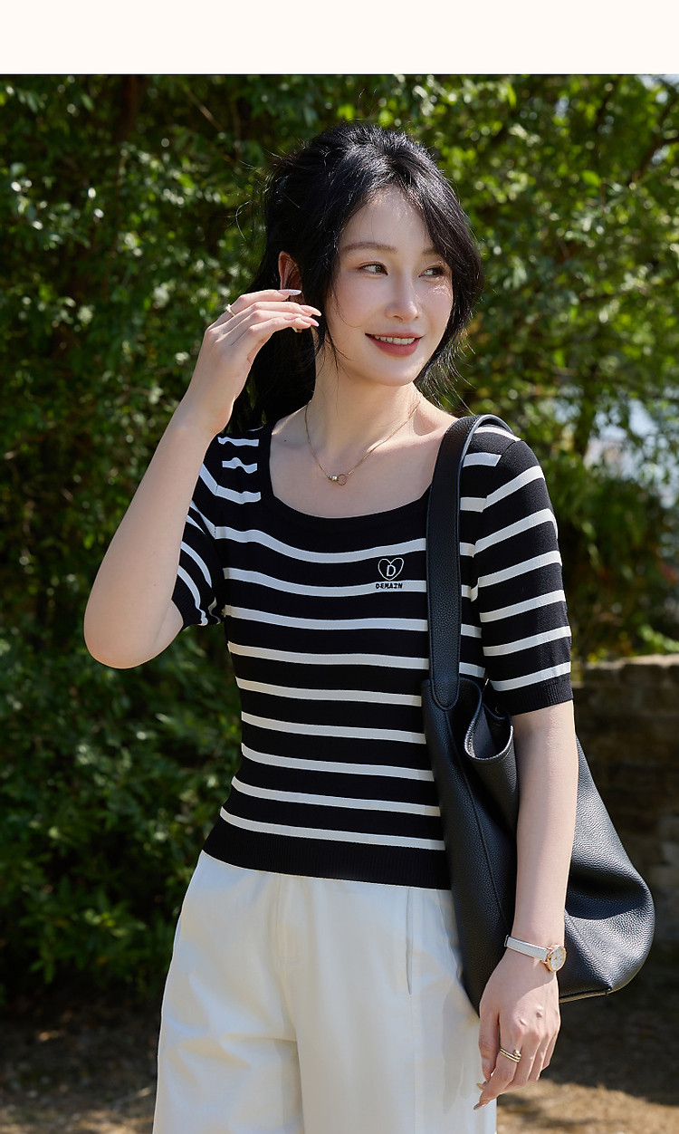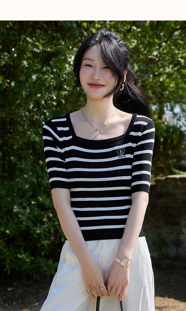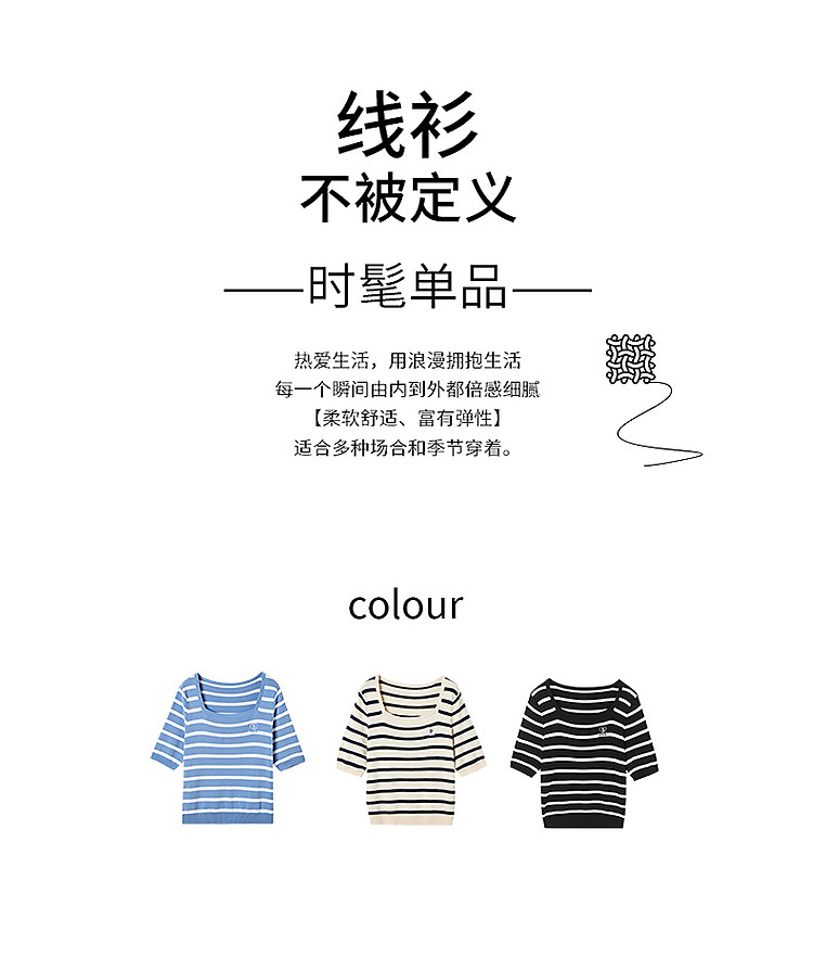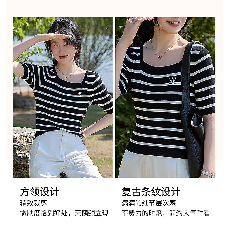 商品名称:【微胖系列】夏季双曲冰麻条纹字母线衫方领小个子针织衫女上衣 287233