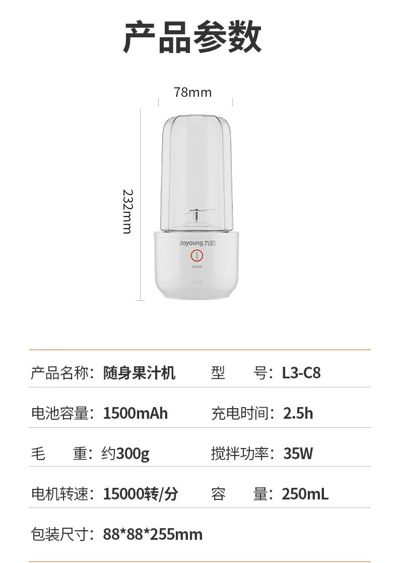 商品名称:九阳 250ml小型便携式迷你电动多功能料理机榨汁杯 L3-C8粉