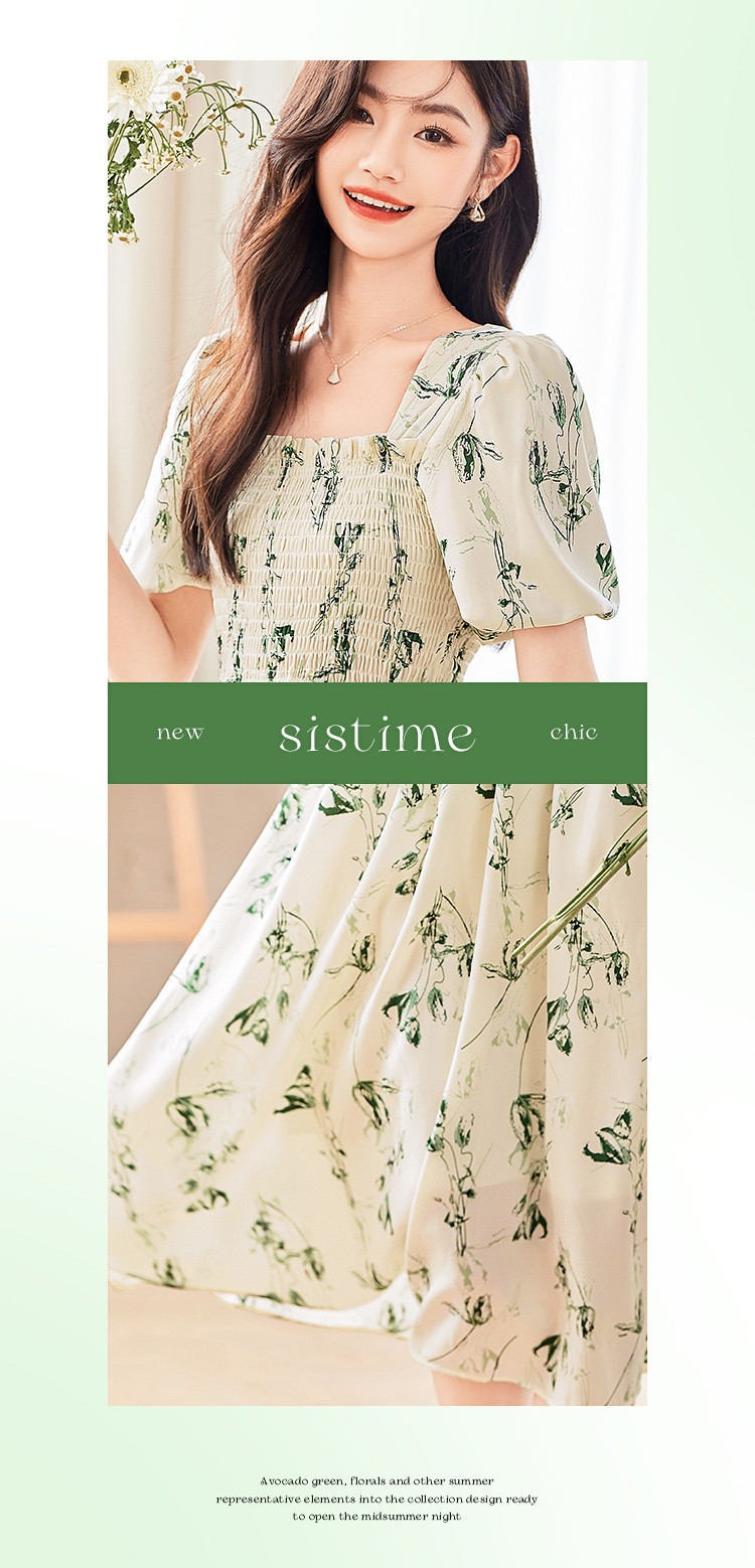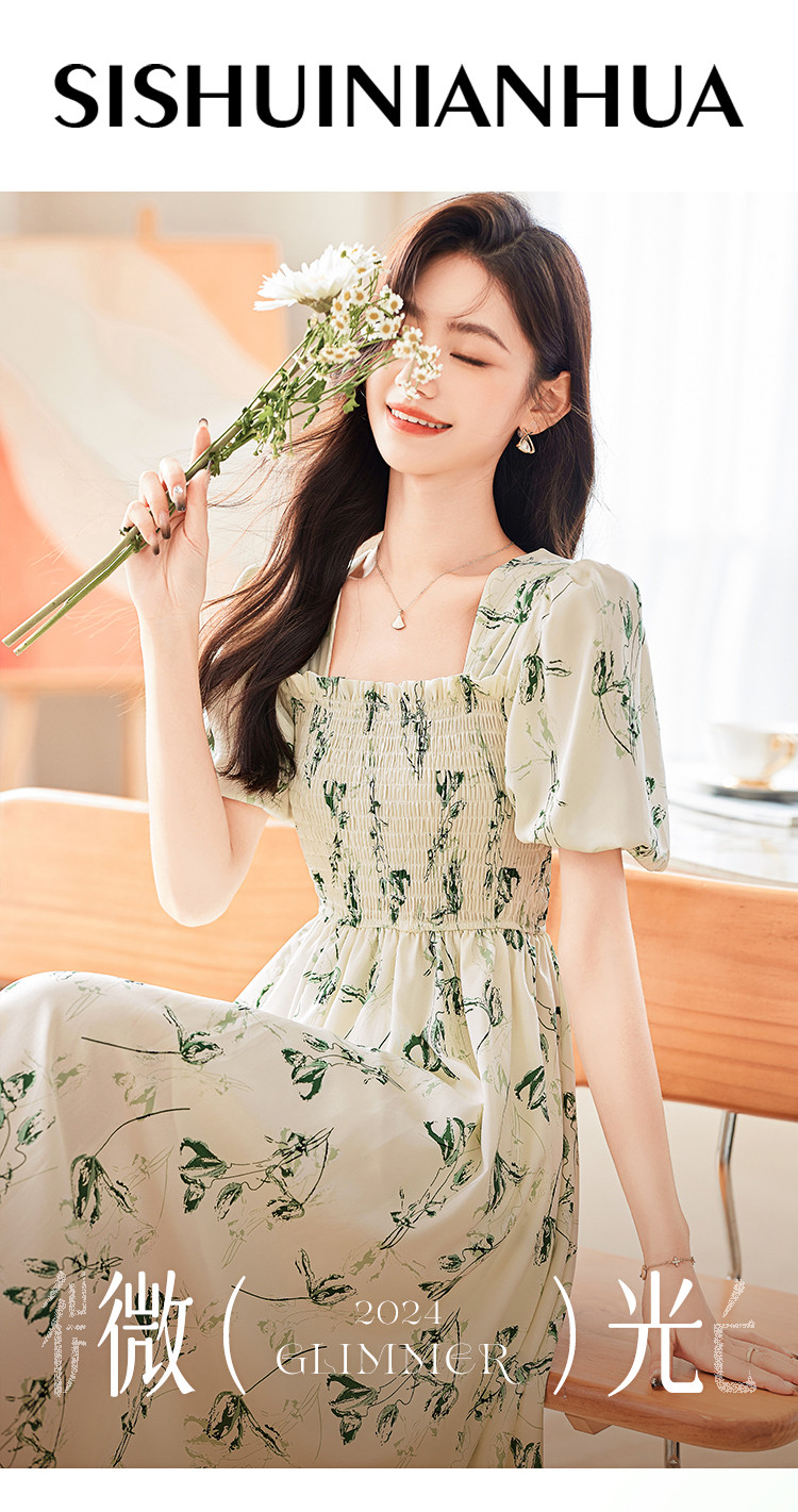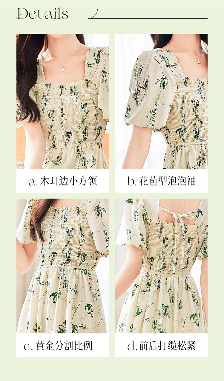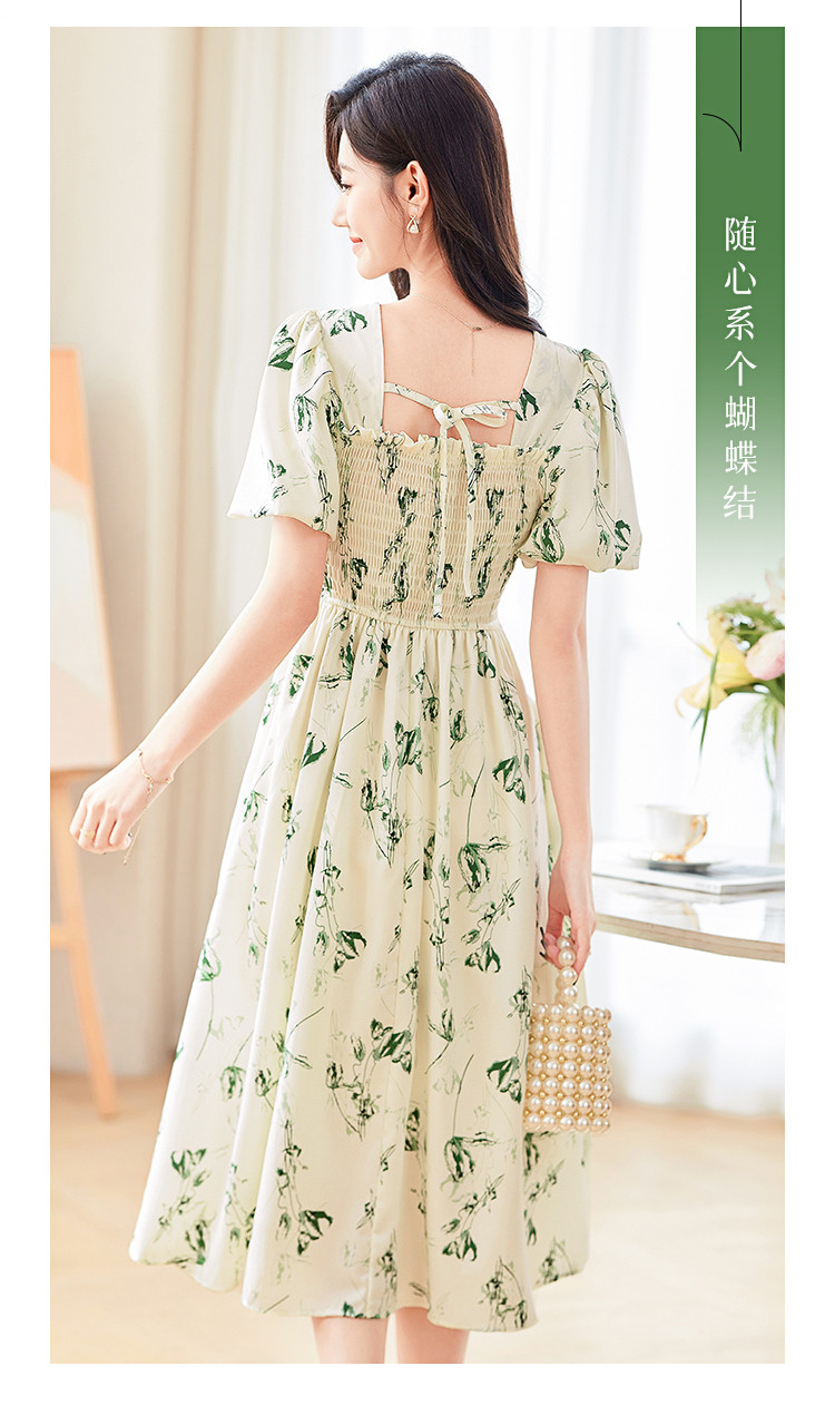 地素夏秋季专柜法式V领甜美印花泡泡袖短袖连衣裙 758539