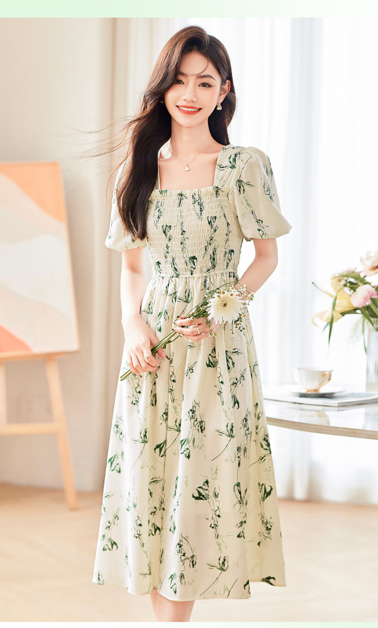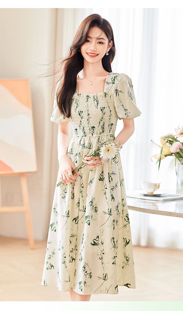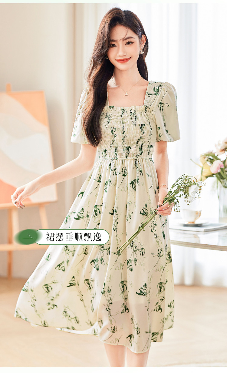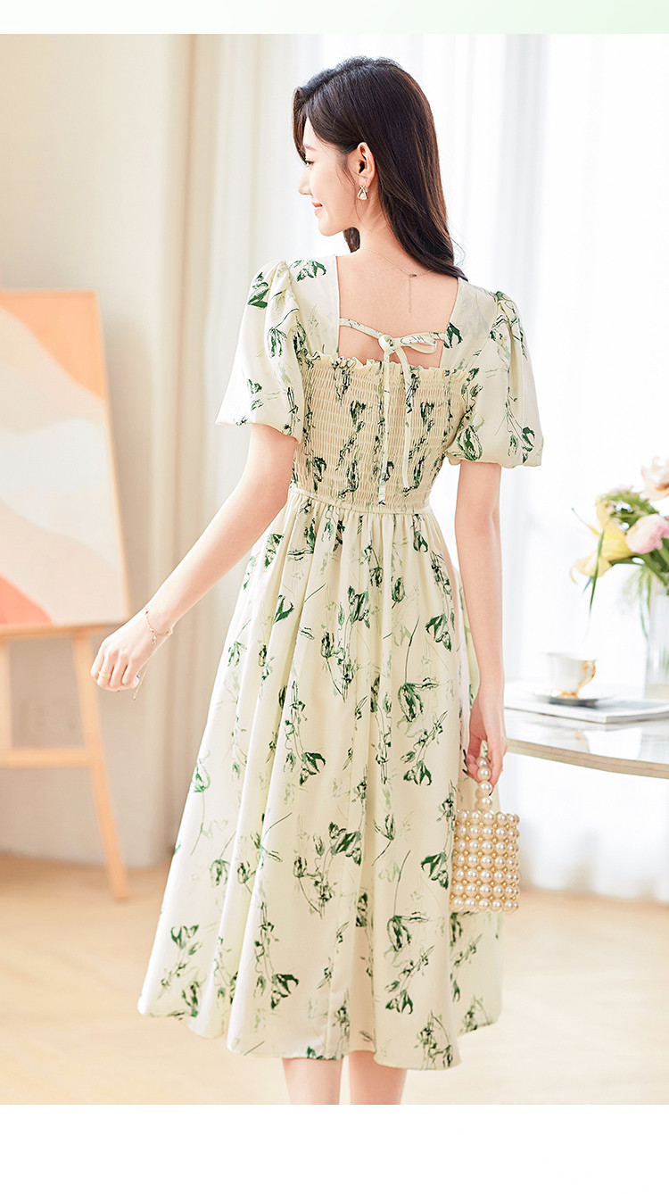 地素夏秋季专柜法式V领甜美印花泡泡袖短袖连衣裙 758539