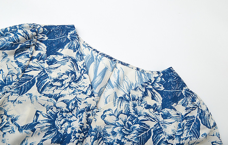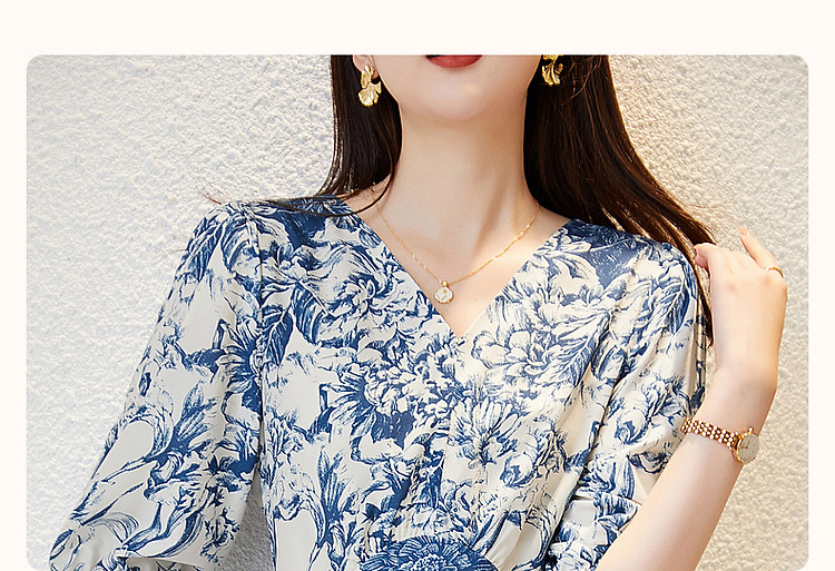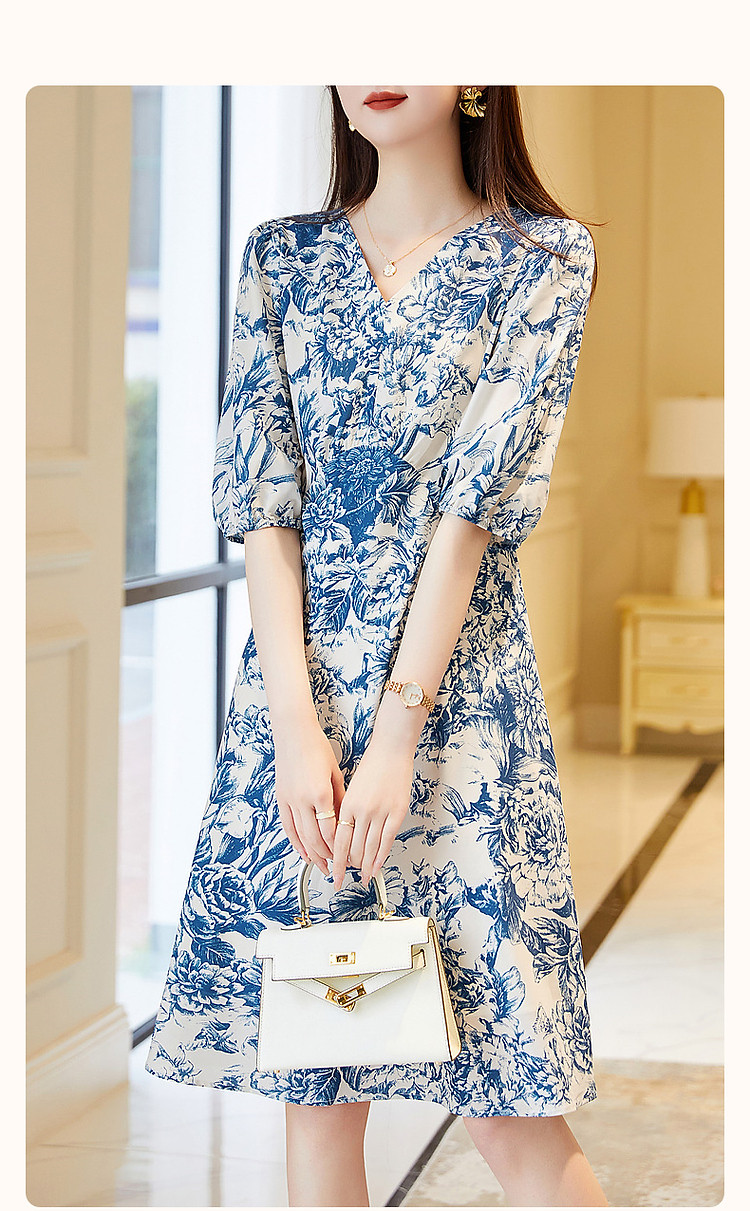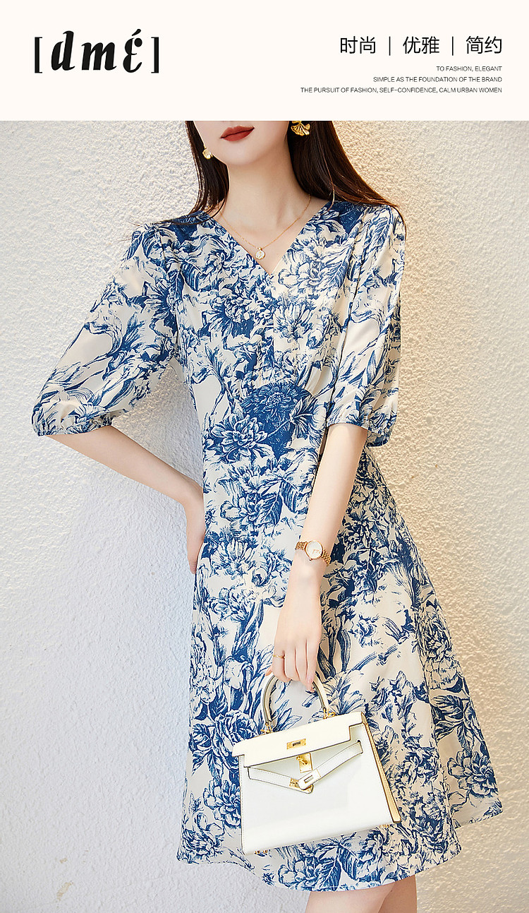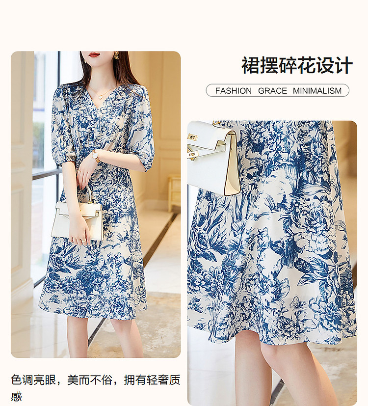 商品名称:【名媛仿丝a字裙】2025夏季V领印花连衣裙女中长款 323393