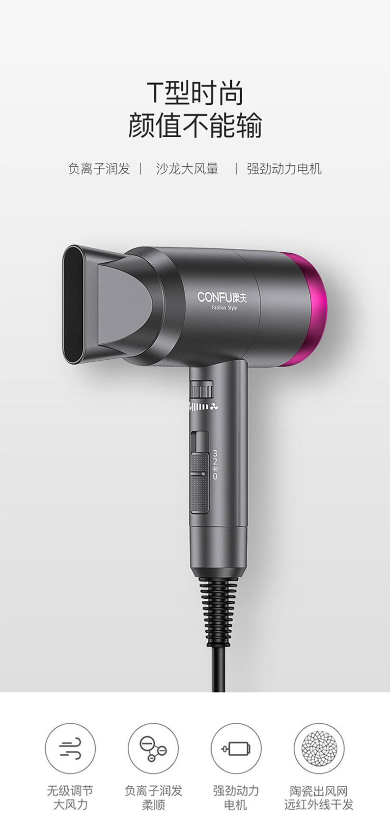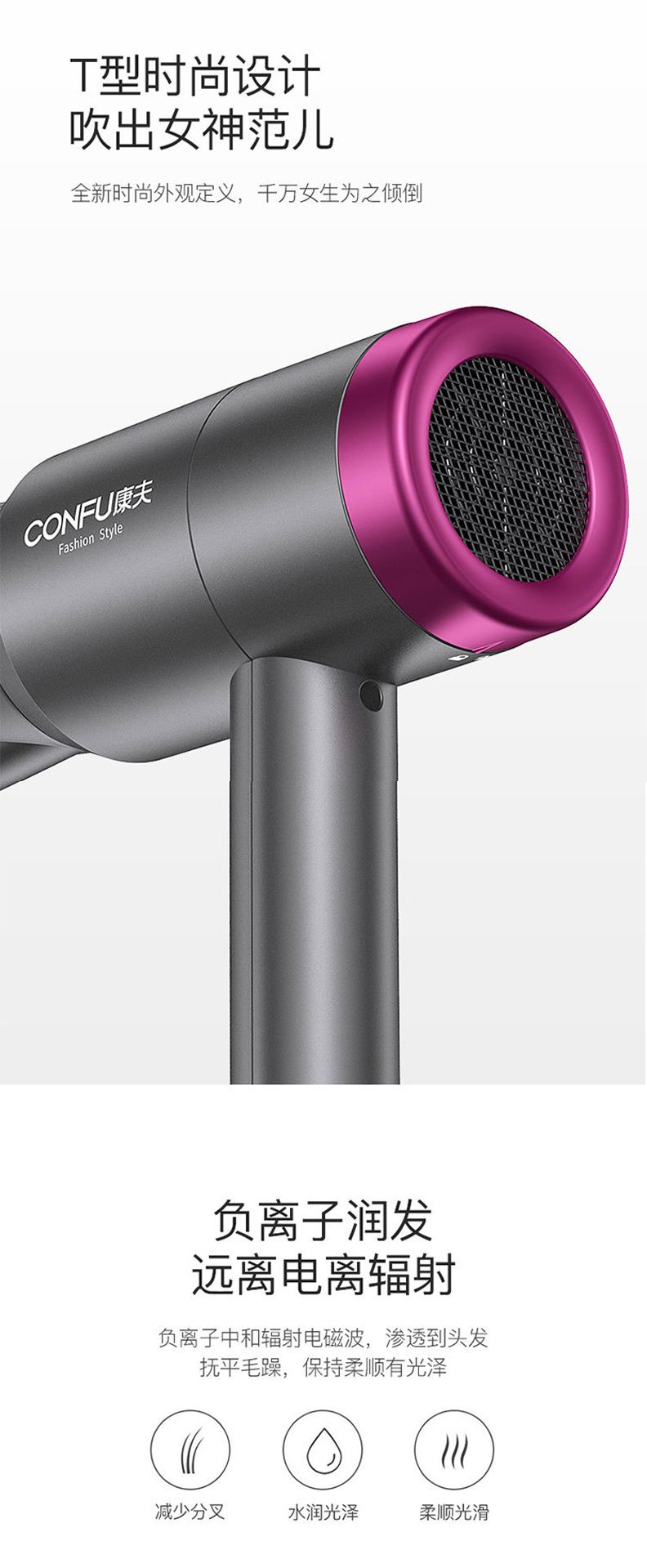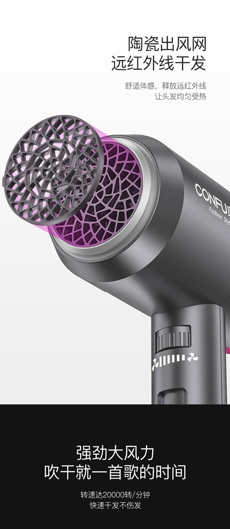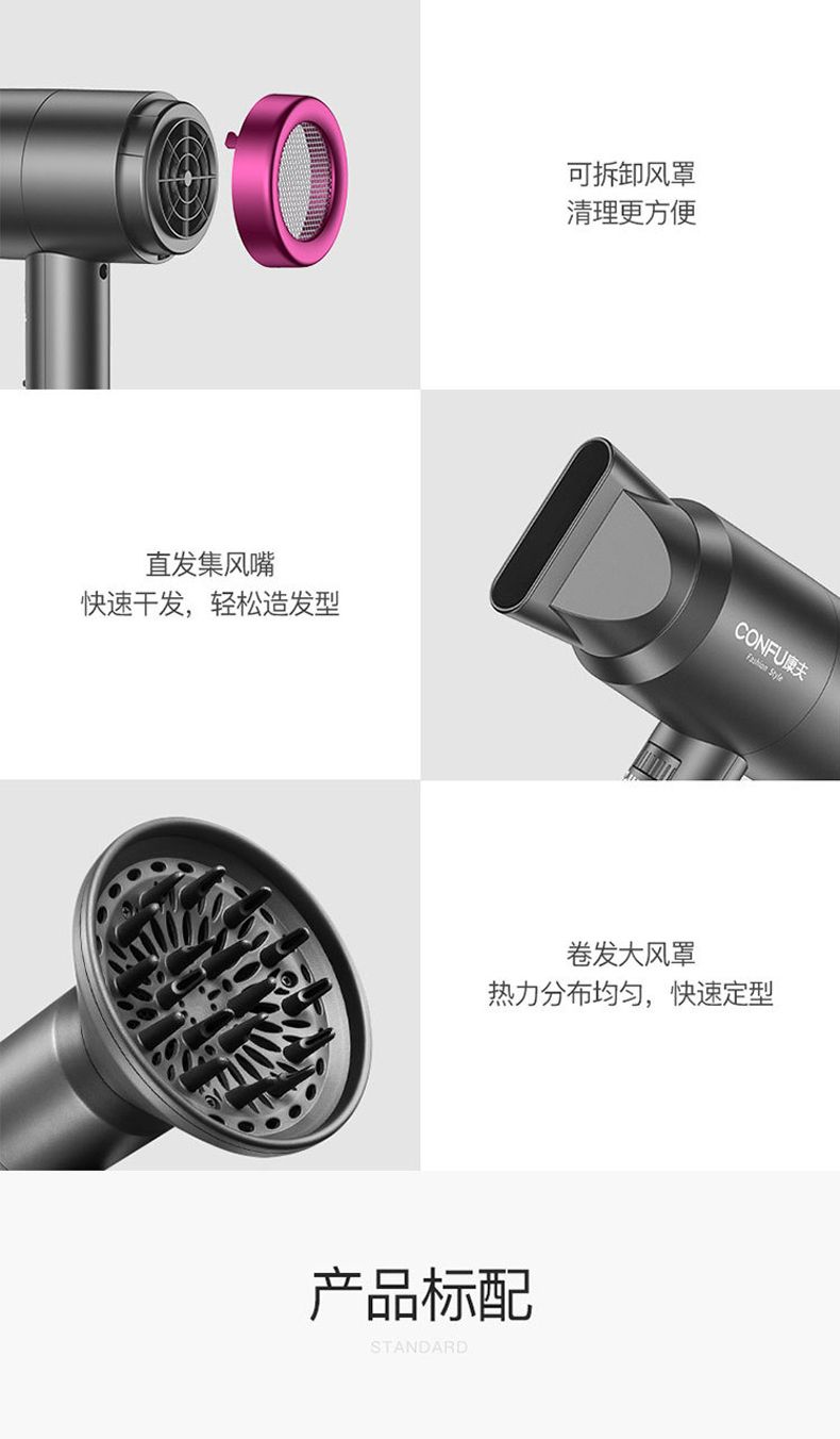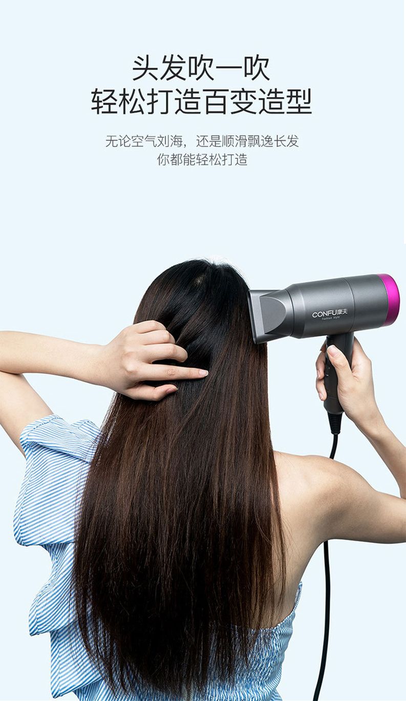 商品名称:CONFU康夫电吹风KF3127 负离子 恒温 冷热风波纹U型发热原理大功率1800W专业集风嘴大风罩特殊电机