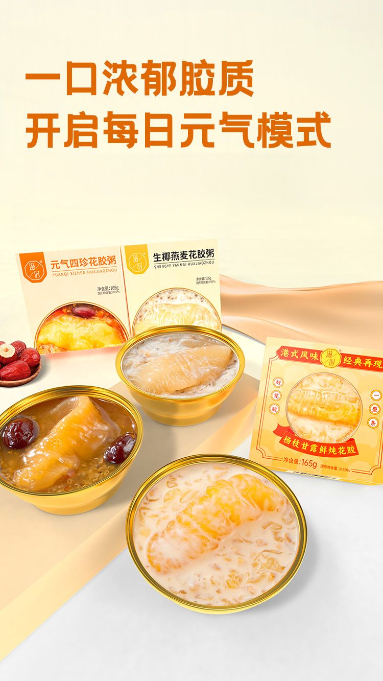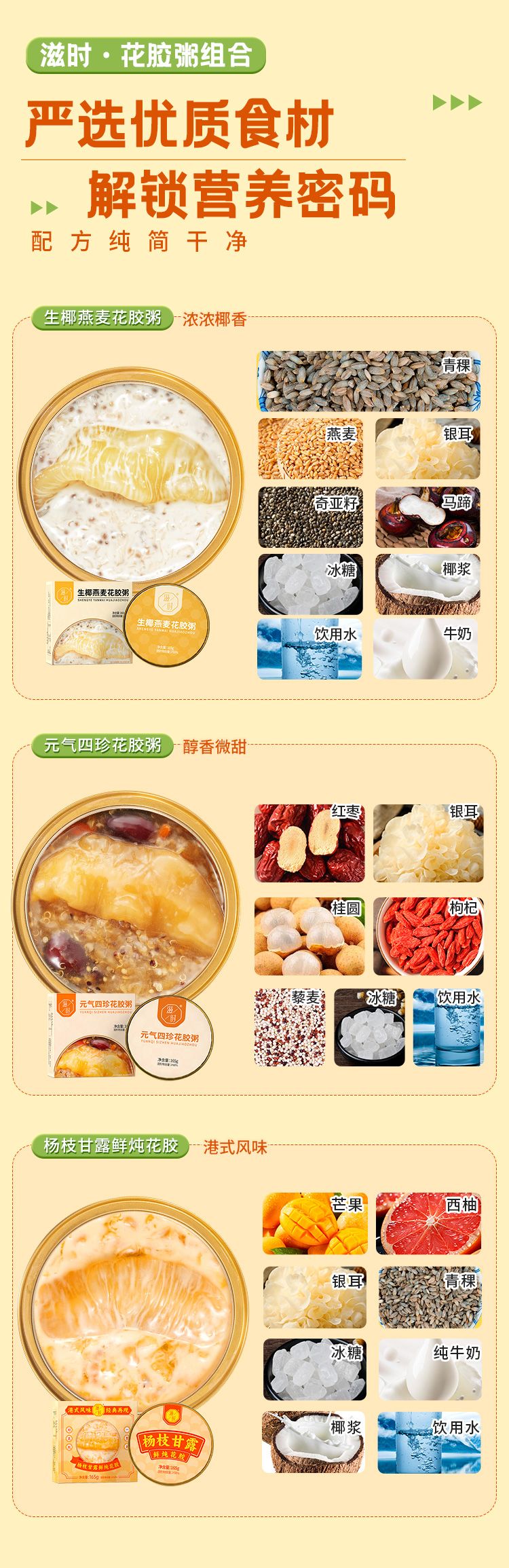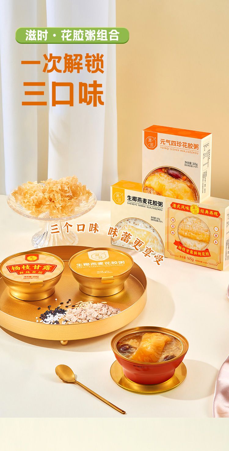 商品名称:滋时滋养即食羹粥组合12碗热销三种组合装 生椰燕麦花胶粥 + 元气四珍花胶粥 + 杨枝甘露鲜炖花胶粥