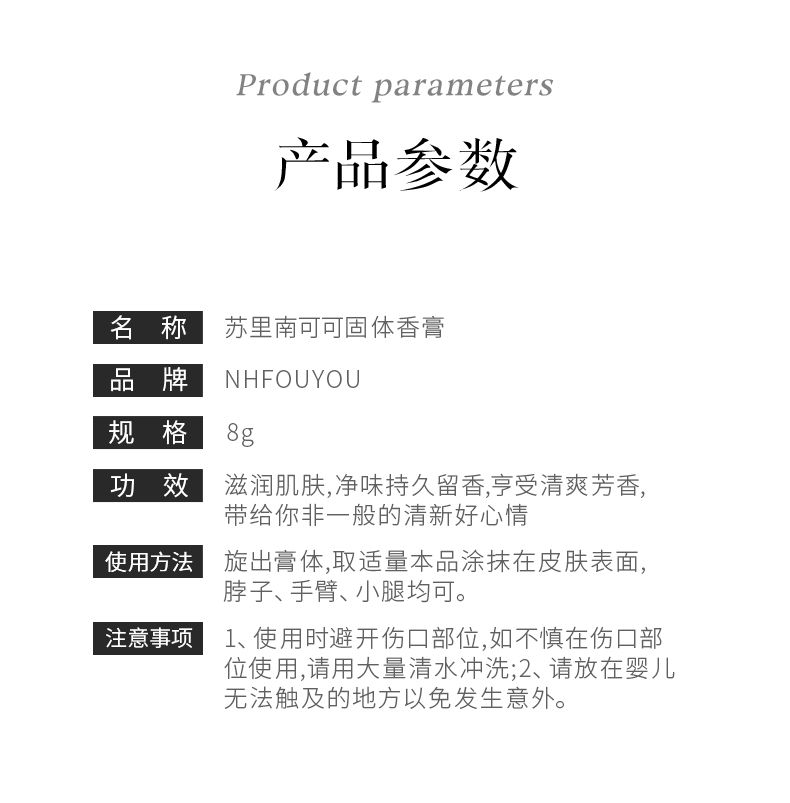 商品名称:NHFOUYOU/草本优子苏里南柠固体香膏8g