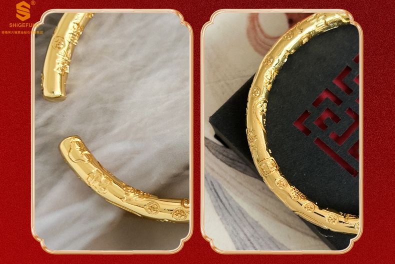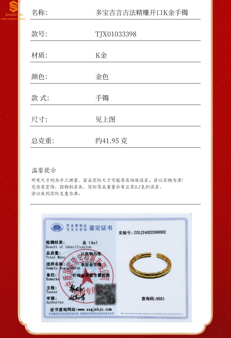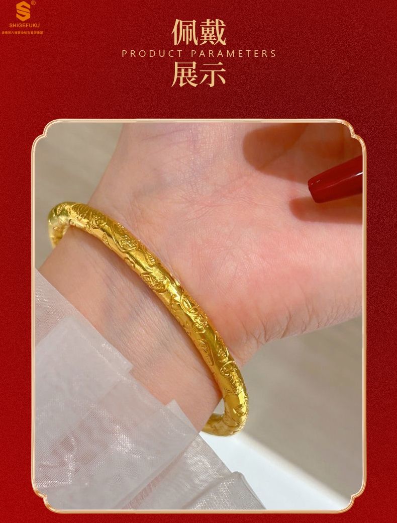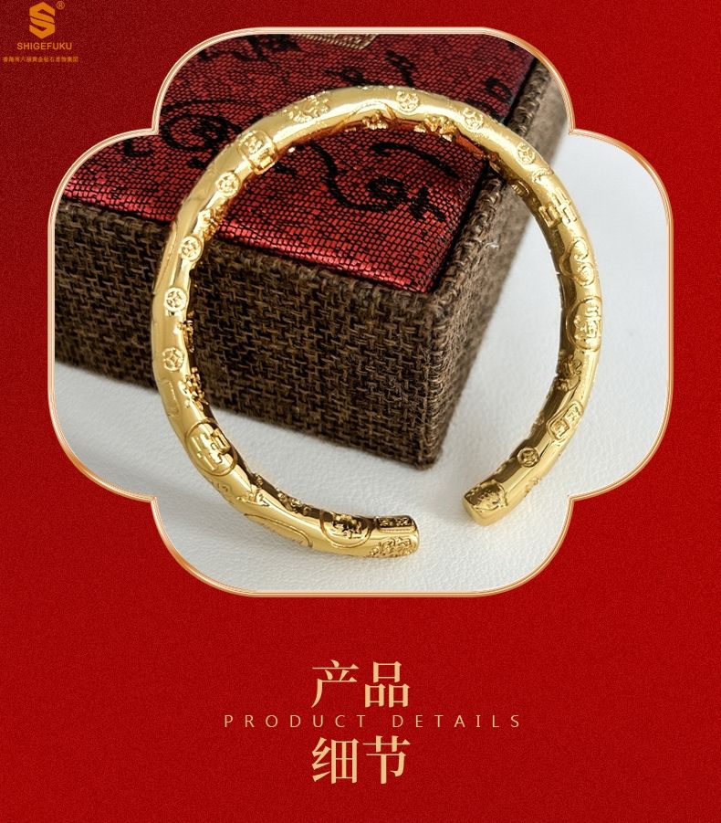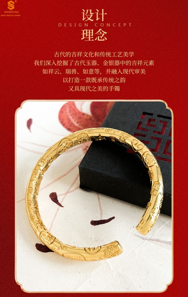 商品名称:香港周六福黄金钻石首饰多宝吉言古法精雕开口K金手镯
