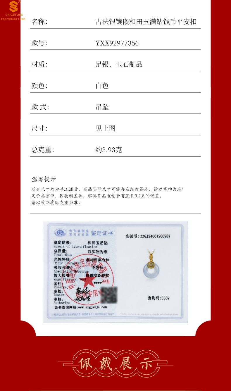 商品名称:香港周六福黄金钻石首饰古法银镶嵌和田玉满钻钱币平安扣