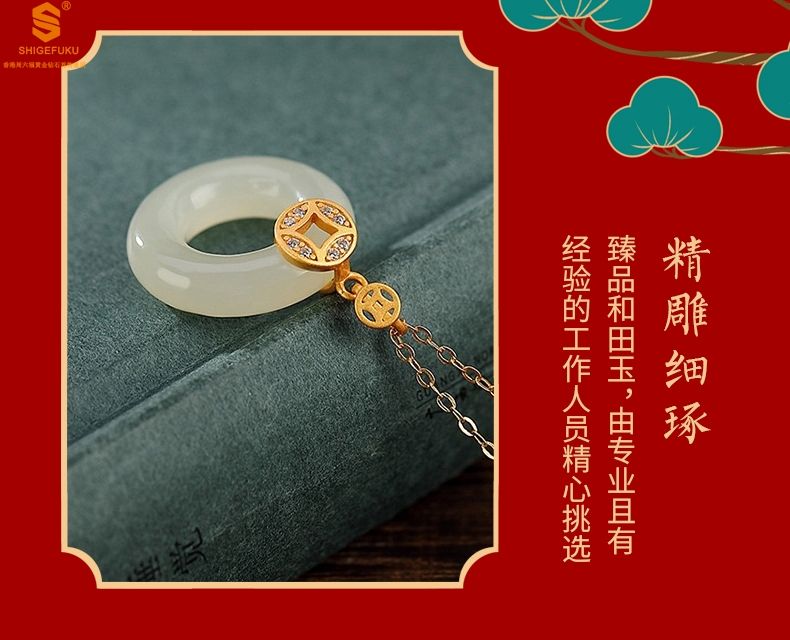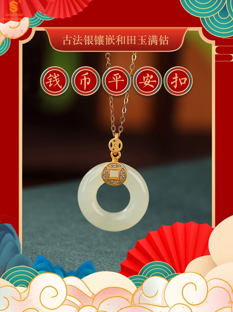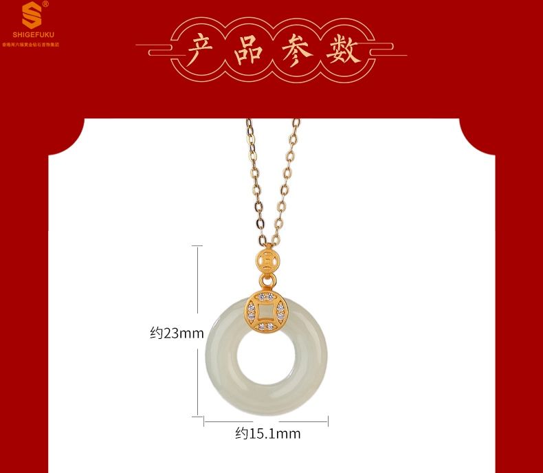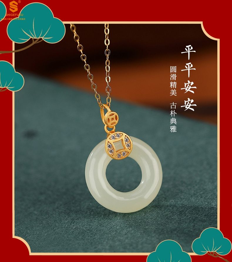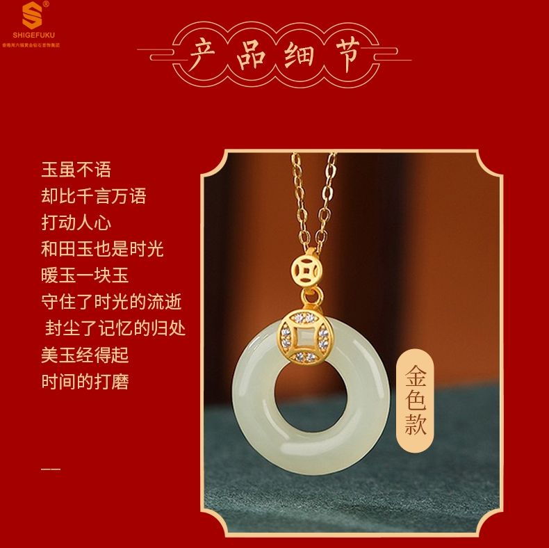 香港周六福黄金钻石首饰古法银镶嵌和田玉满钻钱币平安扣