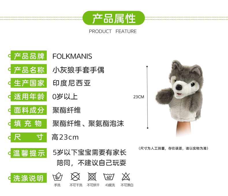 商品名称:福克曼尼斯/FOLKMANIS 仿真互动教育手偶小灰狼手套偶