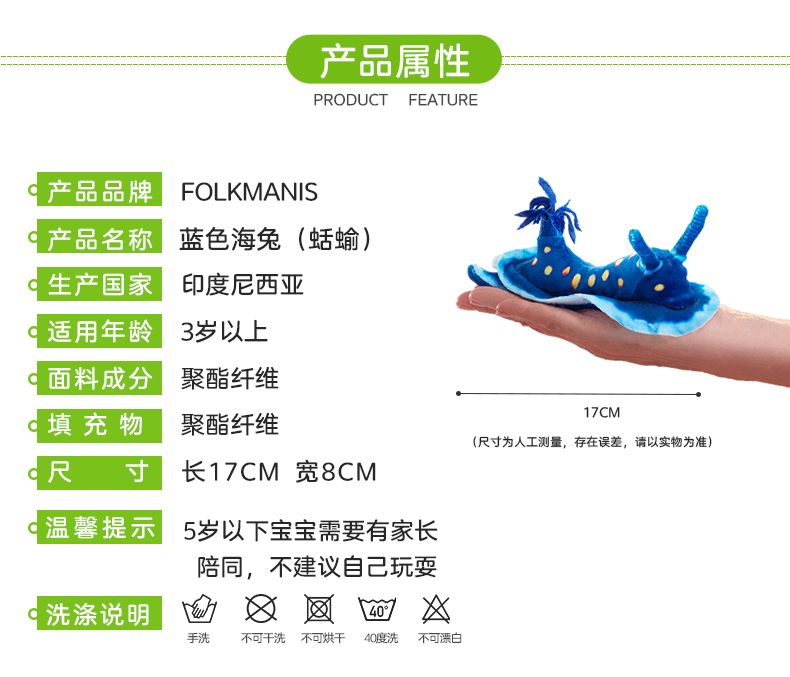 商品名称:福克曼尼斯/FOLKMANIS 仿真互动教育手偶海蛞蝓(海兔)指偶 秋冬新款