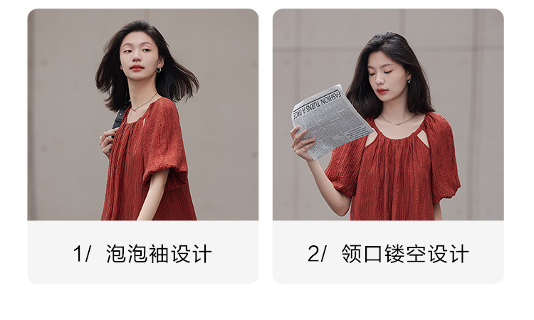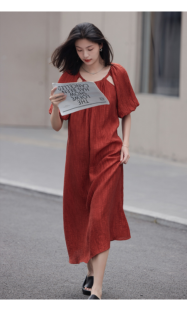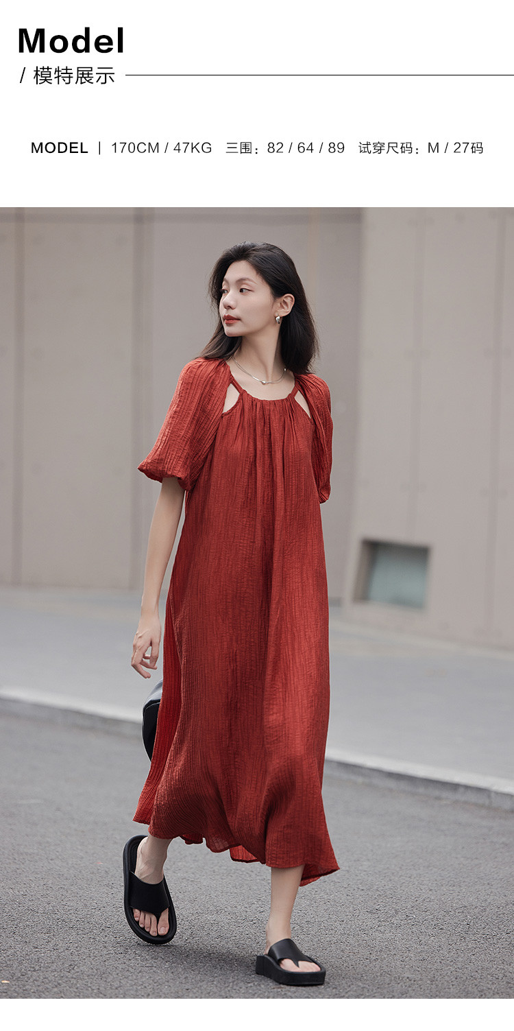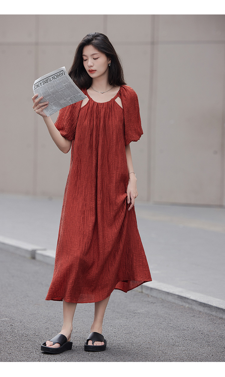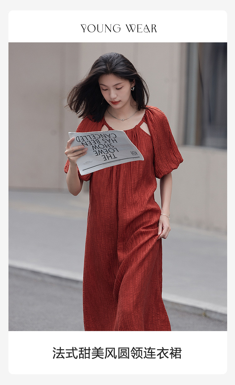 【肌理感连衣裙】夏款圆领镂空设计泡泡袖宽松长款连衣裙女 650050