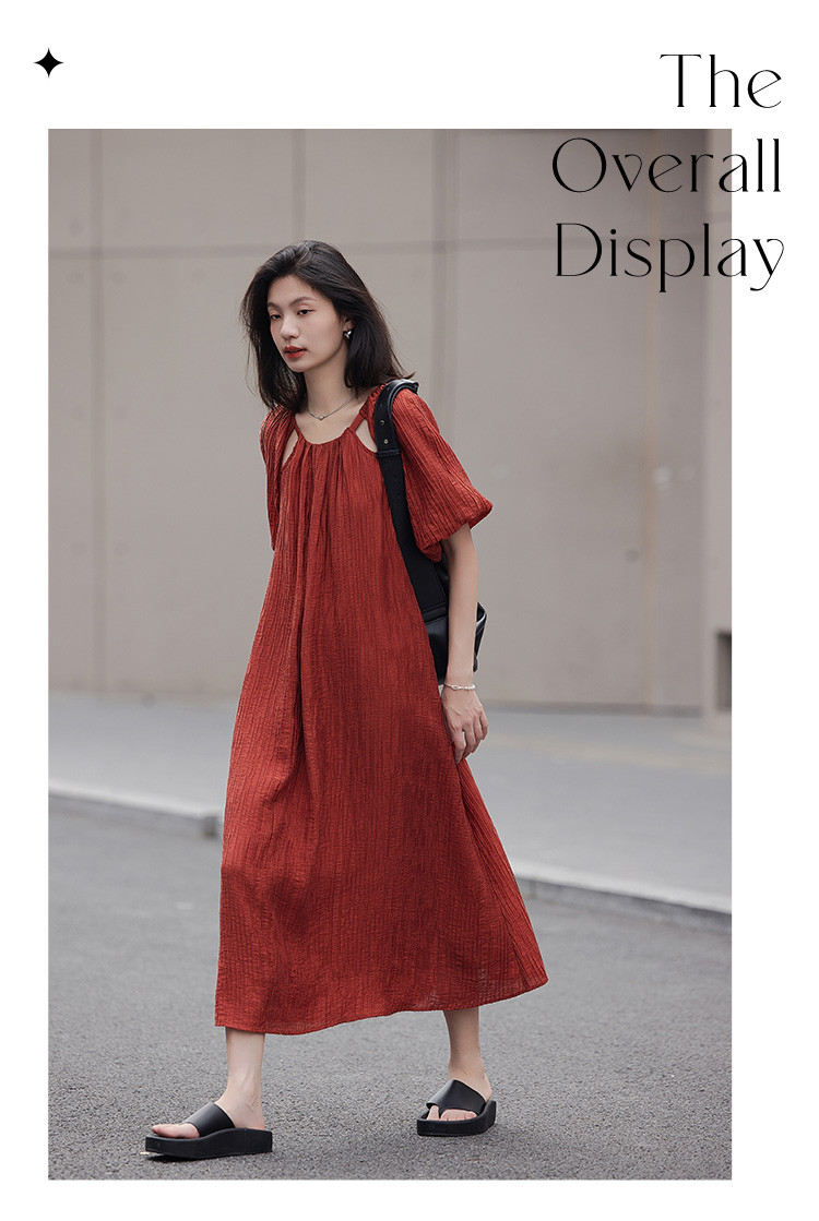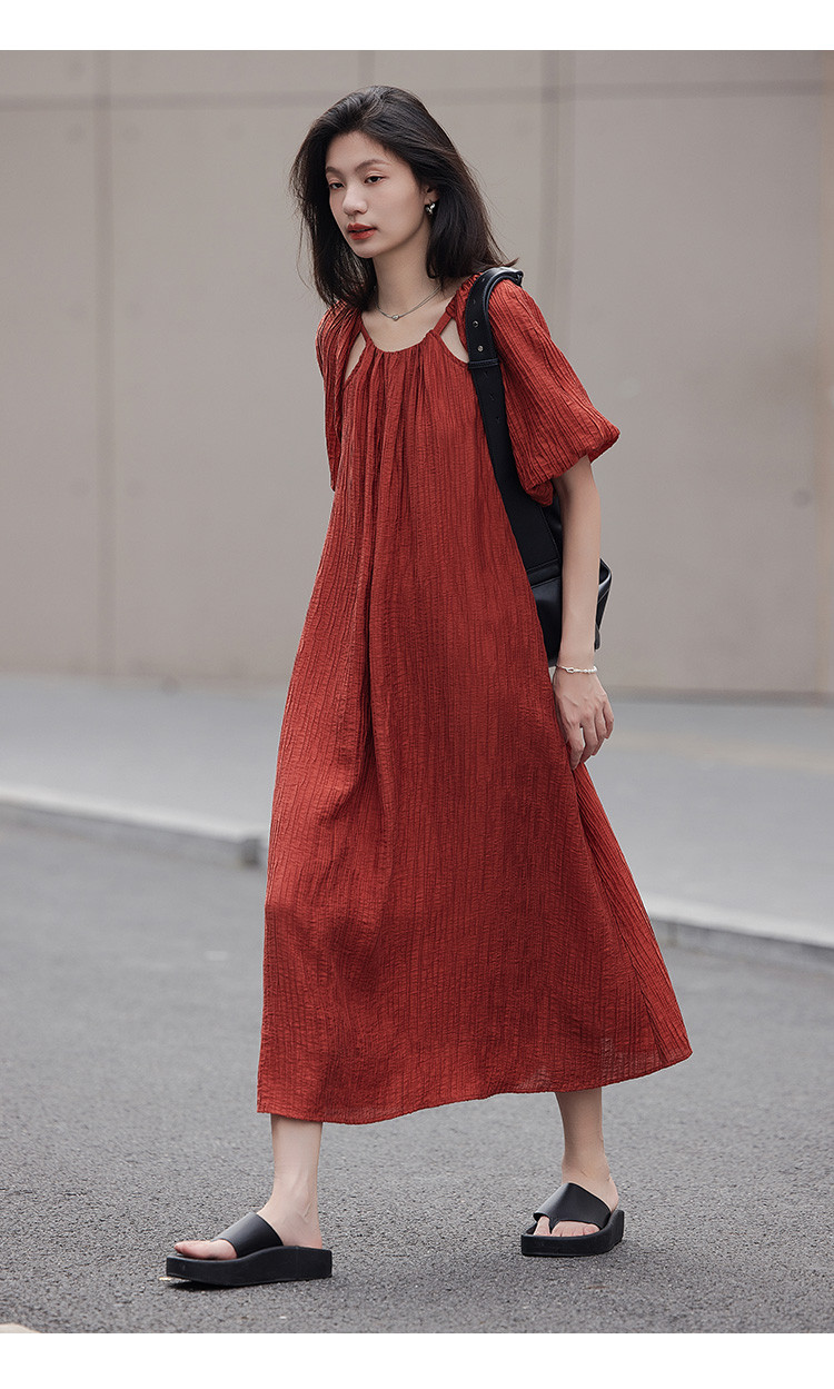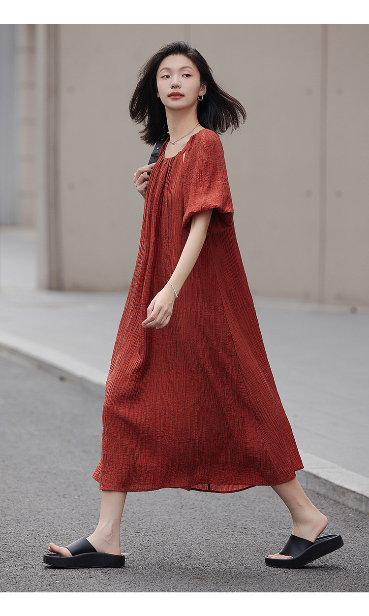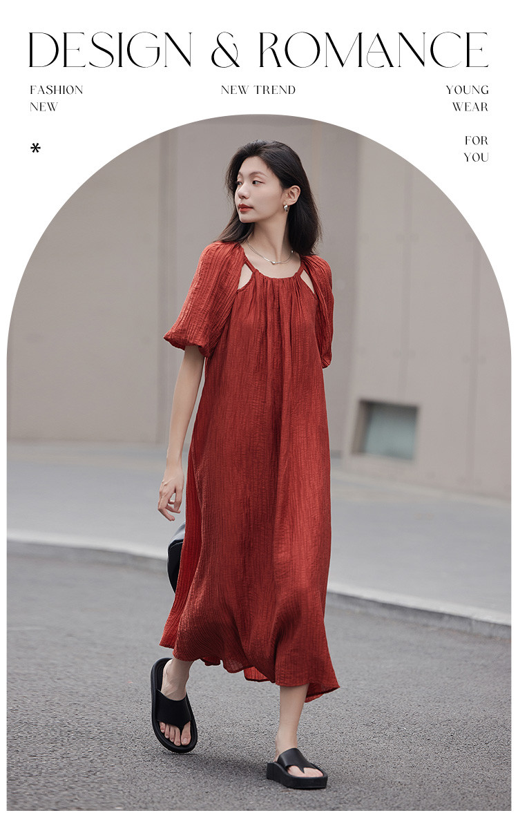 商品名称:【肌理感连衣裙】夏款圆领镂空设计泡泡袖宽松长款连衣裙女 650050