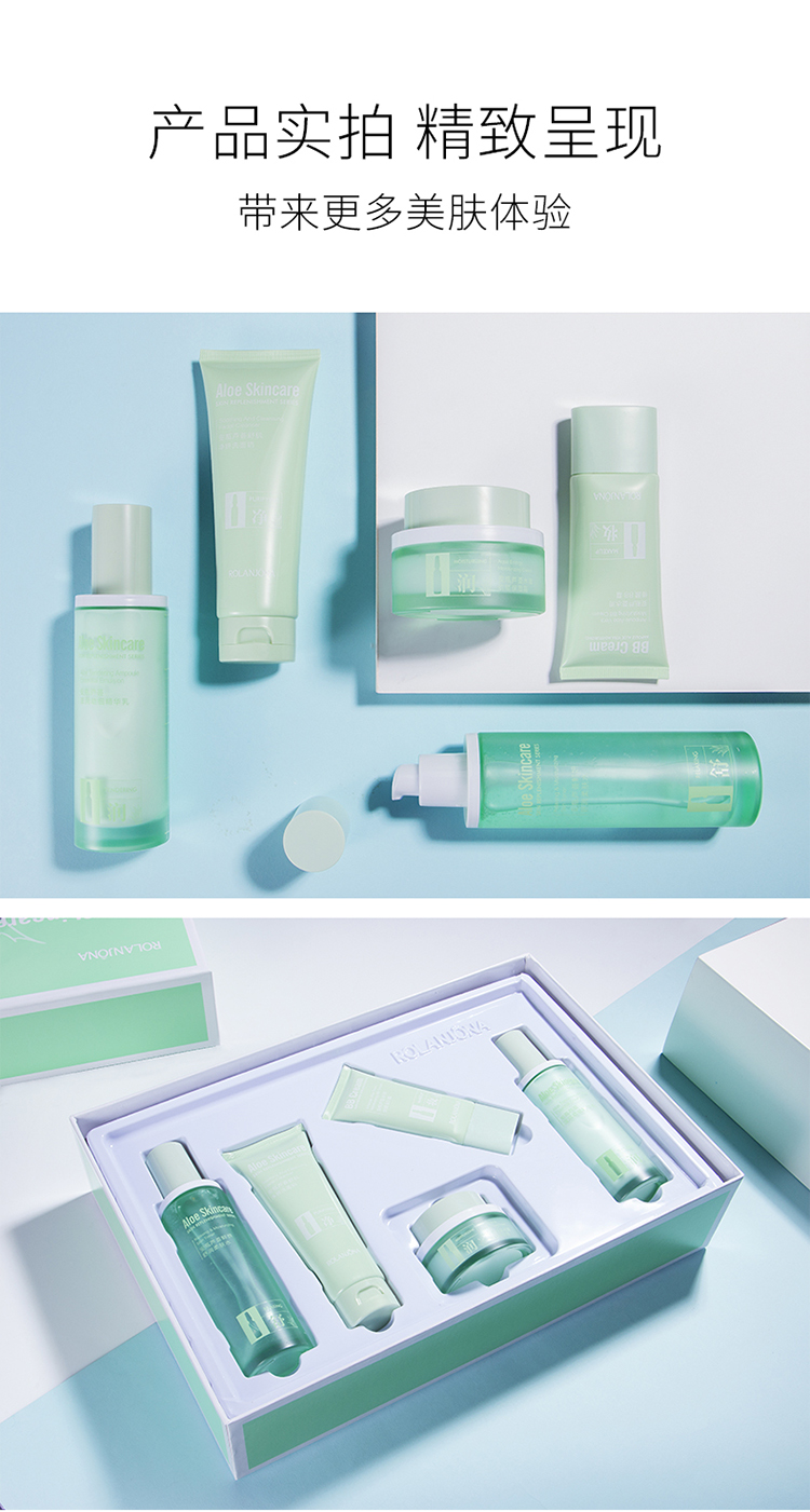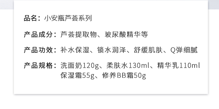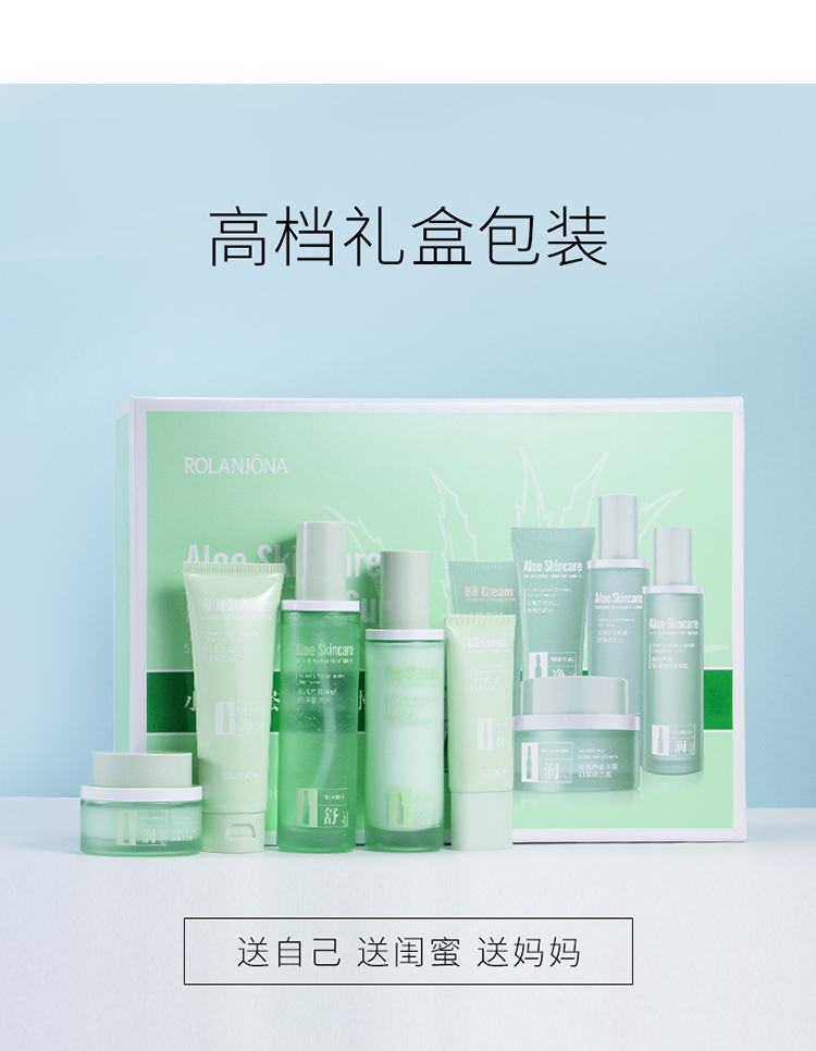 商品名称:露兰姬娜小安瓶芦荟·舒肌补水套盒(洗面奶120g+柔肤水130ml+精华乳110ml+保湿霜55g)